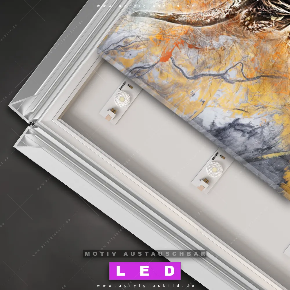 Du bist auf der Suche nach einem dimmbaren Tierwelt LED Bild mit Fernbedienung und optionaler Farbtemperatursteuerung? Dann haben wir hier genau das richtige Wandbild mit LED Beleuchtung für dich: Unser Canvalight® DIA LED Acrylglasbild Abstrakter Highlander im Querformat mit austauschbarer bedruckter Acrylglas-Scheibe. Dieses Leuchtbild bringt sofort Partybeleuchtung in deine Räume!