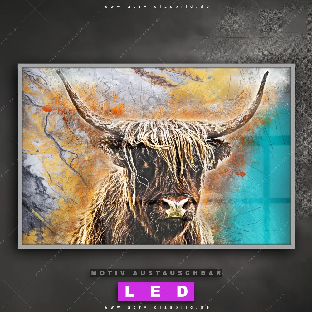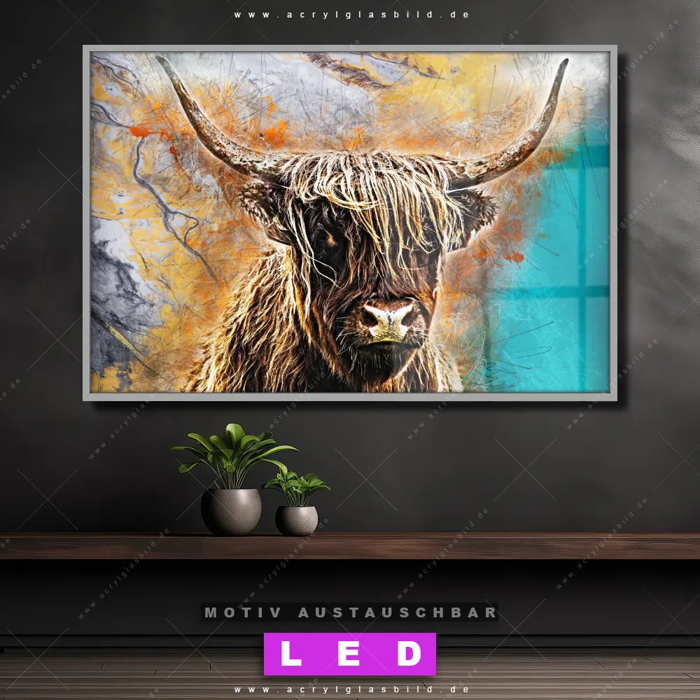 Mit unserem LED Acrylglasbild Canvalight® DIA Hochlandrind-Portrait und seiner genialen LED-Ausleuchtung wirst du nie wieder im Dunkeln auf deinem Sofa herumtappen. Wenn du nach einem beleuchteten Wandbild aus Acrylglas mit Tier, Stier, Hochlandkuh, Highlander, Büffel, Hochlandrind, Rind, Kuh, Hörner, Bulle für Bar - Gastronomie, Büro - Kanzlei, Flur - Eingangsbereich, Wohnzimmer - Schlafzimmer suchst, ist unser LED Leuchtbild Hochlandrind Grunge-Stil in den beeindruckenden Motiv-Farben Braun, Türkis, Beige genau das richtige beleuchtete Wandbild für dich. Gestaltet im Abstrakt, Grunge, Mixed Media, Modern Art Stil, passt dieses LED Wandbild mit DIA-Klapprahmen und glänzender Front aus Acrylglas perfekt zu jedem Einrichtungsstil – sogar zu deinem chaotischen kreativen Durcheinander!