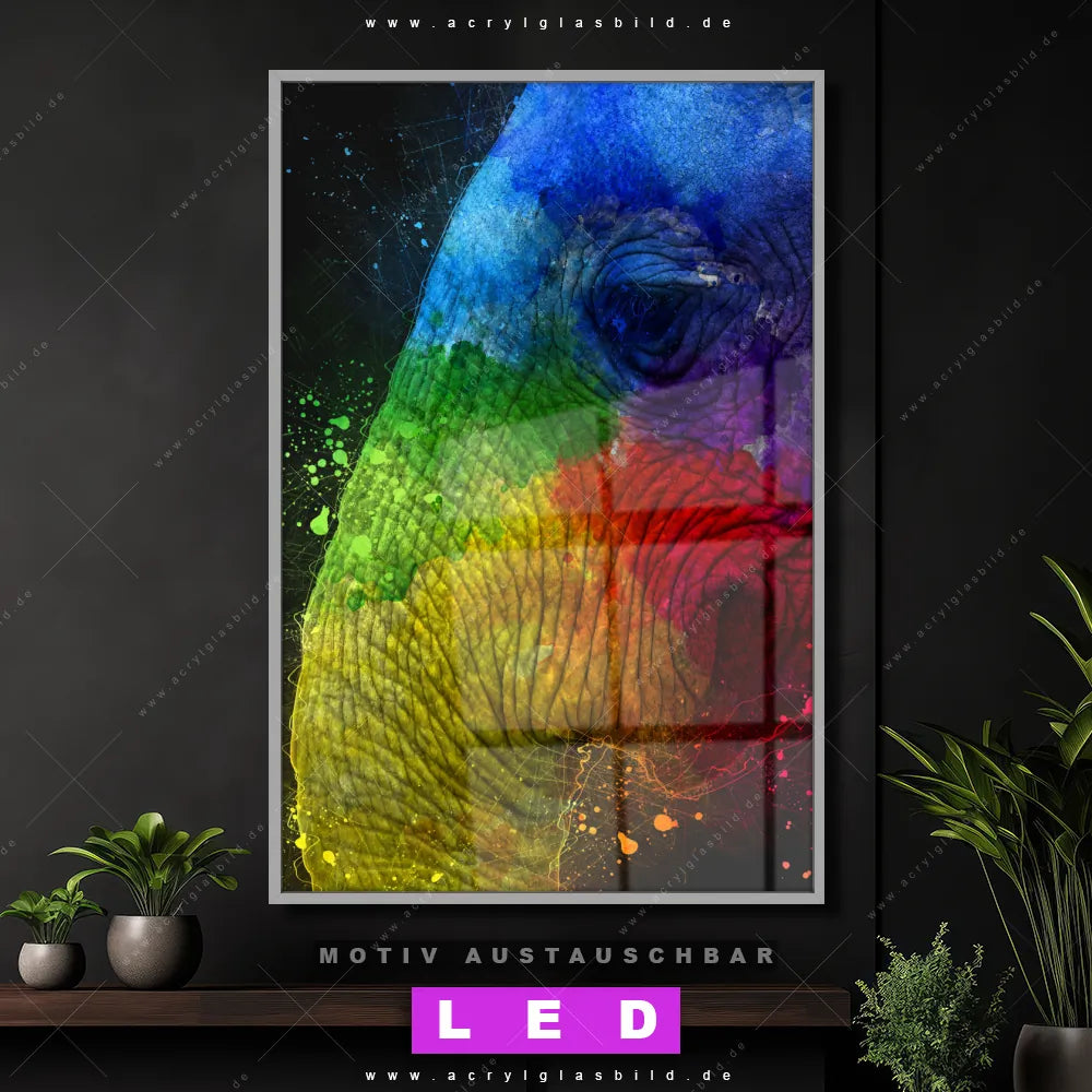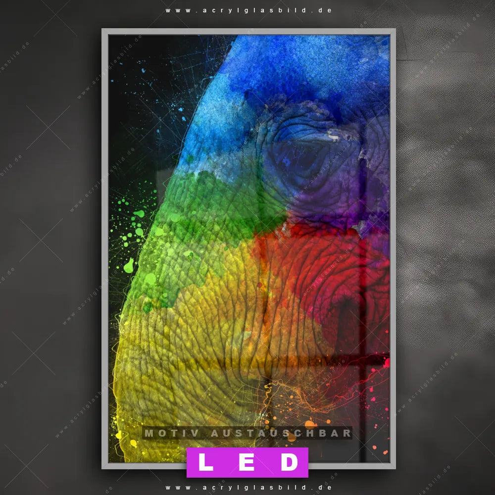 Wer braucht schon langweilige Wände, wenn man sie mit unserem LED Acrylglasbild Canvalight® DIA Aquarell-Elefant in lebendigen Farben aufpeppen kann? Dank der genialen LED-Ausleuchtung wirst du in Arzt - Praxis, Bar - Gastronomie, Flur - Eingangsbereich, Büro - Kanzlei, Wohnzimmer - Schlafzimmer nie wieder über deine eigenen Füße stolpern. Wenn du nach einem beleuchteten Wandbild aus Acrylglas mit Pop Art, Kunst, bunt, Tier, Elefant, Afrika, wild, Safari suchst, dann ist unser LED Acrylglasbild Bunter Elefant in abstrakter Malerei in den hammermäßigen Motiv-Farben Bunt genau das richtige LED Bild für dich. Im coolen Abstrakt, Pop Art, Modern Art Stil gestaltet, passt das LED Leuchtbild mit DIA-Klapprahmen und glänzender Front aus Acrylglas perfekt zu jedem Einrichtungsstil – sogar zu deinem chaotischen Kreativlabor!