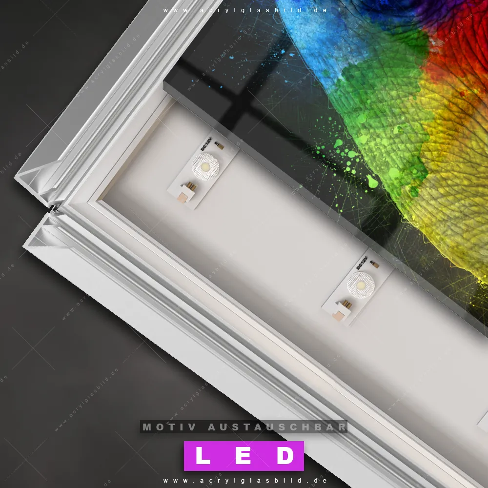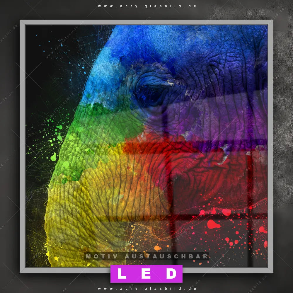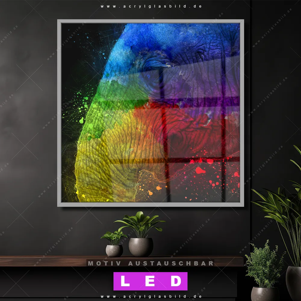 Also, worauf wartest du noch? Gib mit einem beleuchteten Wandbild mit wechselbarer Acrylglas-Scheibe deinen Wänden das gewisse Etwas und bestelle jetzt das LED Acrylglasbild Canvalight® DIA Farbenfrohes Elefantenprofil – dein Zuhause wird es dir danken und deine Freunde werden dank der wechselbaren Motive erblassen!