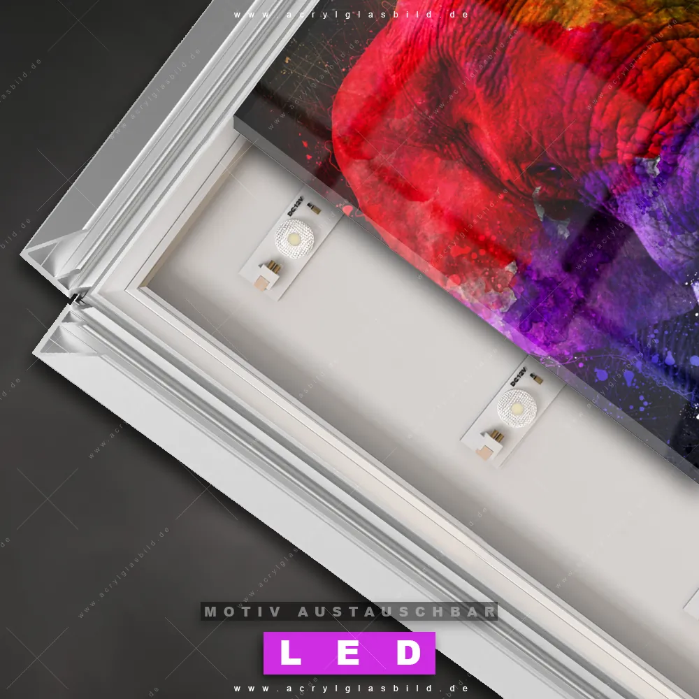Also, worauf wartest du noch? Gib mit einem beleuchteten Wandbild mit wechselbarer Acrylglas-Scheibe deinen Wänden das gewisse Etwas und bestelle jetzt das LED Acrylglasbild Canvalight® DIA Farbexplosion im Elefantenprofil – dein Zuhause wird es dir danken und deine Freunde werden dank der wechselbaren Motive erblassen!