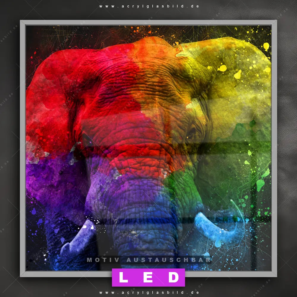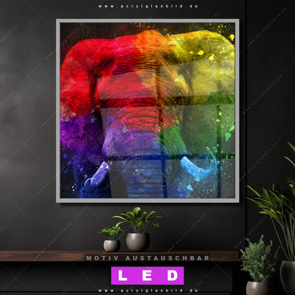 Vergiss dunkle Ecken und Langeweile! Mit unserem Acrylglasbild Regenbogen-Elefant im Porträt und seiner brillanten LED-Ausleuchtung wirst du dich nie wieder in der Dunkelheit verirren. Wenn du auf der Suche nach einem beleuchteten Wandbild aus Acrylglas mit Pop Art, Kunst, bunt, Tier, Elefant, Afrika, wild, Safari, Farbe, Farbspritzer bist, ist unser LED Acrylglasbild Canvalight® DIA Elefant im künstlerischen Stil mit den strahlenden Motiv-Farben Bunt, Schwarz genau das richtige Leuchtbild für dich. Das im Abstrakt, Pop Art, Modern Art Stil gestaltete LED Bild mit glänzender Front aus Acrylglas passt perfekt zu jedem Einrichtungsstil in Arzt - Praxis, Bar - Gastronomie, Büro - Kanzlei, Flur - Eingangsbereich, Wohnzimmer - Schlafzimmer – vom minimalistischen Chic bis zum kreativen Chaos.