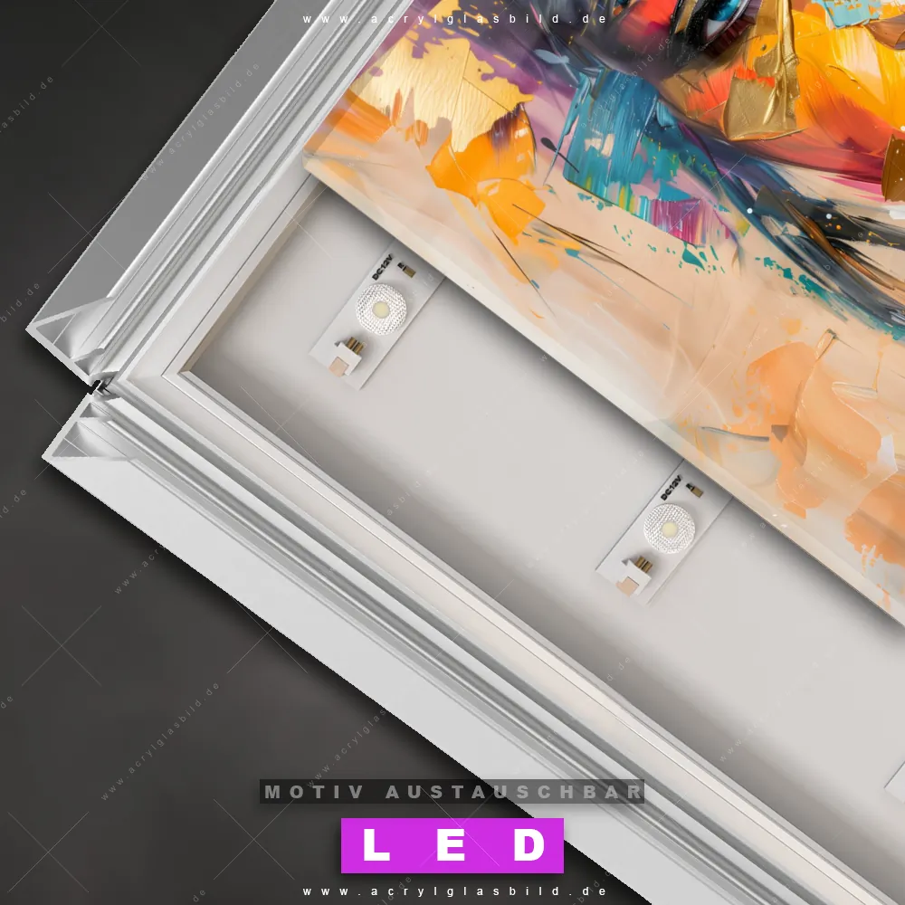 Vergiss dunkle Ecken und Langeweile! Mit unserem Acrylglasbild Abstrakte Schönheit und seiner brillanten LED-Ausleuchtung wirst du dich nie wieder in der Dunkelheit verirren. Wenn du auf der Suche nach einem beleuchteten Wandbild aus Acrylglas mit Porträt, Frau, Gesicht, Farbexplosion, Farbspritzer, Frauenporträt bist, ist unser LED Acrylglasbild Canvalight® DIA Moderne Kunstvision einer Frau mit den strahlenden Motiv-Farben Bunt, Orange, Blau, Pink, Gold genau das richtige Leuchtbild für dich. Das im Abstrakt, Modern Art Stil gestaltete LED Bild mit glänzender Front aus Acrylglas passt perfekt zu jedem Einrichtungsstil in Friseur - Beauty, Wohnzimmer - Schlafzimmer, Flur - Eingangsbereich – vom minimalistischen Chic bis zum kreativen Chaos.