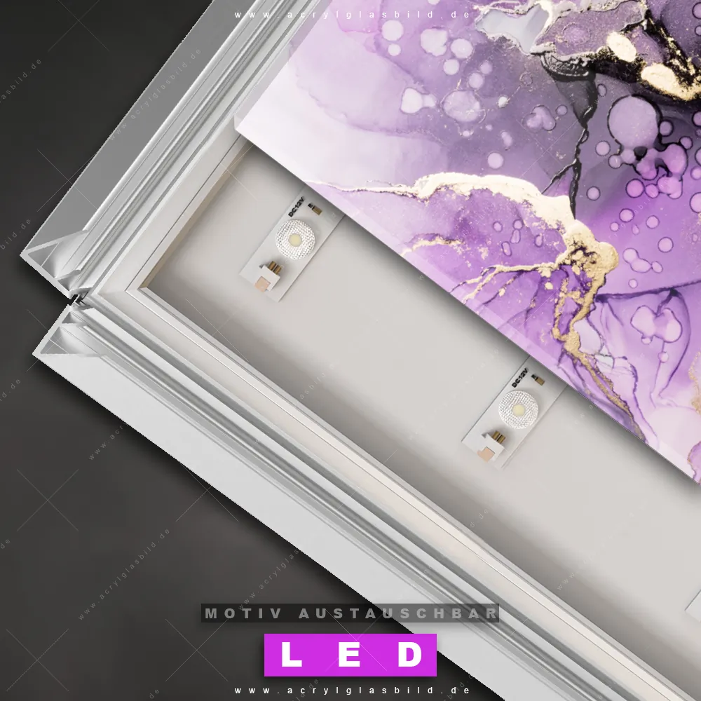 Wer braucht schon langweilige Wände, wenn man sie mit unserem LED Acrylglasbild Canvalight® DIA Fluid Painting lila-gold aufpeppen kann? Dank der genialen LED-Ausleuchtung wirst du in Arzt - Praxis, Büro - Kanzlei, Wohnzimmer - Schlafzimmer, Bar - Gastronomie, Friseur - Beauty nie wieder über deine eigenen Füße stolpern. Wenn du nach einem beleuchteten Wandbild aus Acrylglas mit Flüssigkeit, Acryl, flüssig, Farbe, Marmorierung, Tinte, Alkohol, Fluid Art suchst, dann ist unser LED Acrylglasbild fließende Farben lila-gold in den hammermäßigen Motiv-Farben Gold, Lila, Schwarz genau das richtige LED Bild für dich. Im coolen Abstrakt, Modern Art Stil gestaltet, passt das LED Leuchtbild mit DIA-Klapprahmen und glänzender Front aus Acrylglas perfekt zu jedem Einrichtungsstil – sogar zu deinem chaotischen Kreativlabor!