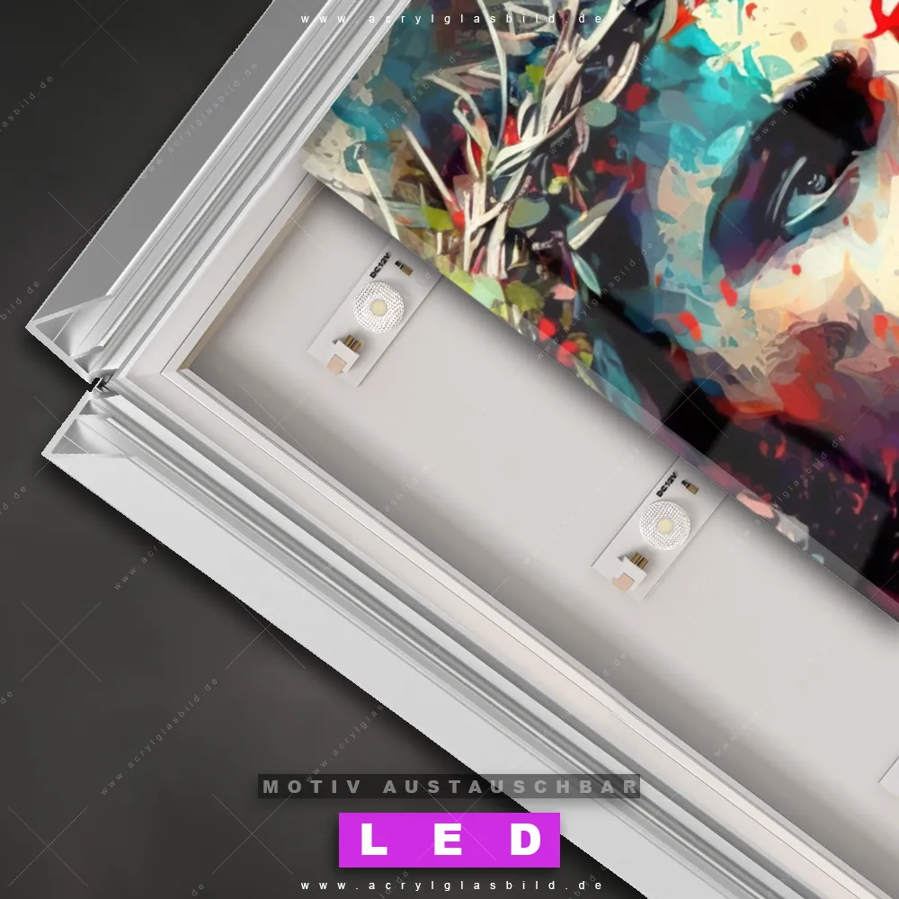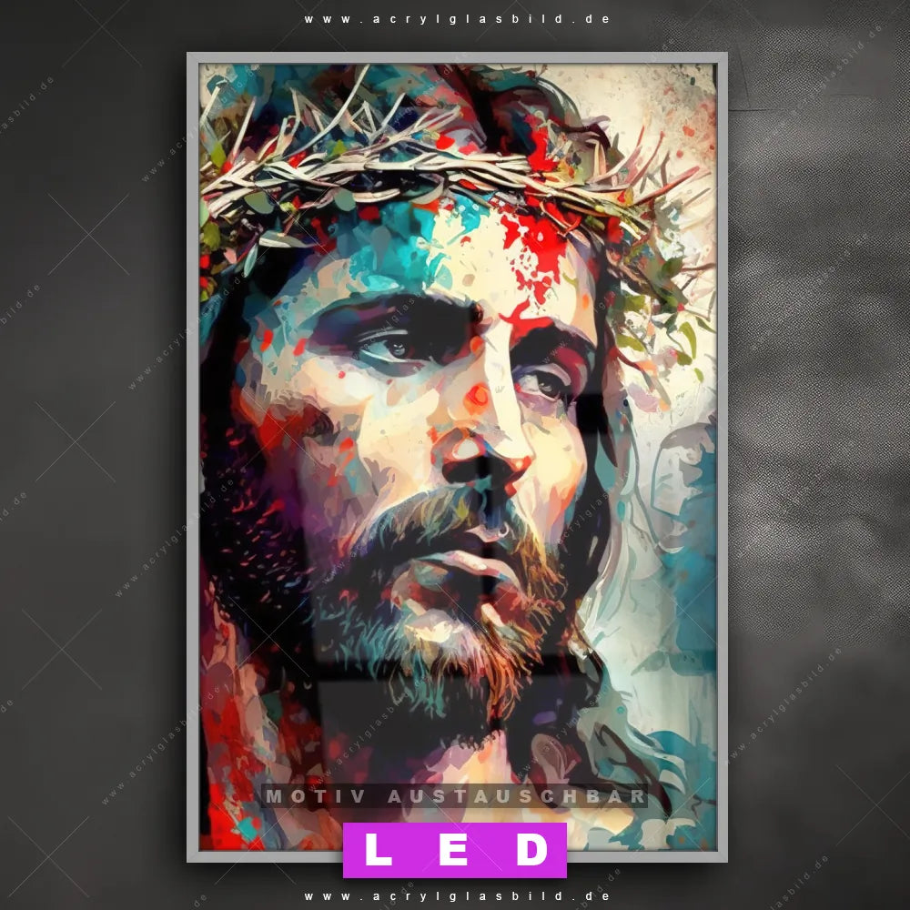 Du suchst nach einem Wandbild mit LED Beleuchtung als ultimativen Hingucker für deine Wände? Dann haben wir das perfekte dimmbare LED Bild mit Fernbedienung und optionaler Farbtemperatursteuerung für dich: unser abgefahrenes Porträts - Menschen Canvalight® DIA LED Acrylglasbild! Mit dem LED Leuchtbild aus Acrylglas Jesus Christus mit Dornenkrone im Hochformat mit austauschbarer bedruckter Acrylglas-Scheibe bringst du nicht nur Licht, sondern auch ordentlich Stil in deine Bude.