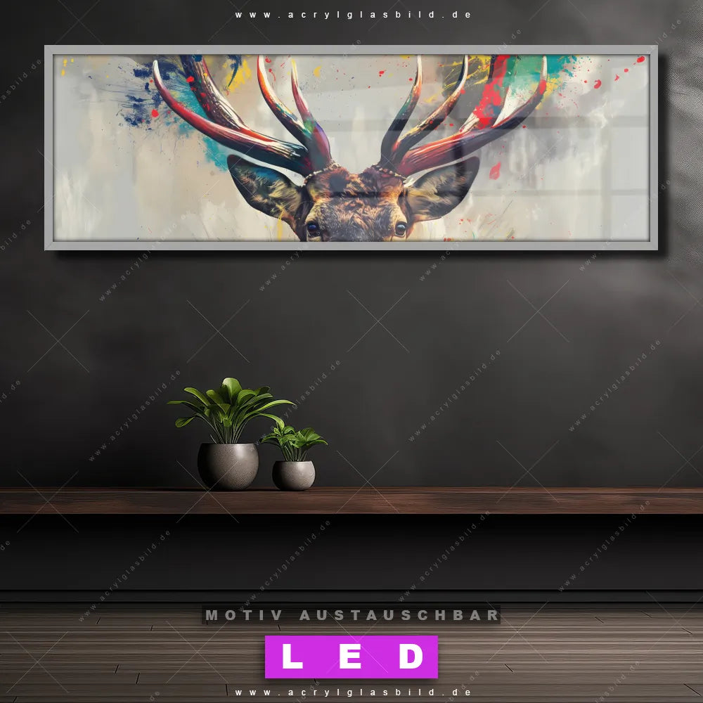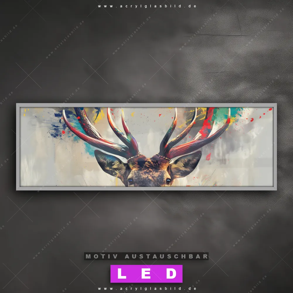 LED Acrylglasbild Canvalight® DIA | Kreativer Hirsch mit Farbspritzern | Panorama