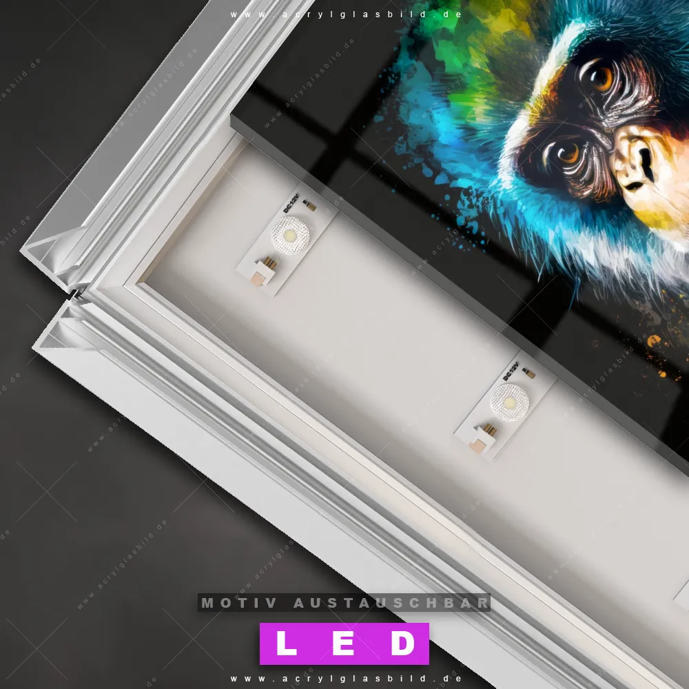 Also, worauf wartest du noch? Gib mit einem beleuchteten Wandbild mit wechselbarer Acrylglas-Scheibe deinen Wänden das gewisse Etwas und bestelle jetzt das LED Acrylglasbild Canvalight® DIA Schimpanse mit Farbspritzern – dein Zuhause wird es dir danken und deine Freunde werden dank der wechselbaren Motive erblassen!