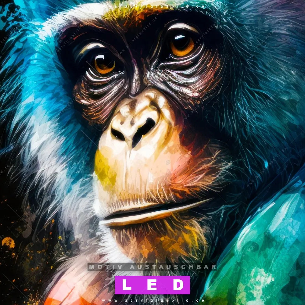 Bist du bereit, deine Wände mit einem dimmbaren LED Bild mit Fernbedienung und optionaler Farbtemperatursteuerung zum Leuchten zu bringen? Wir haben das ultimative Tierwelt LED Acrylglasbild Canvalight® DIA für dich! Unser LED Wandbild aus Acrylglas Schimpanse in bunten Farben im Quadratischen Format mit austauschbarer bedruckter Acrylglas-Scheibe im DIA-Klapprahmen bringt sofort jede Menge Glanz in deine vier Wände.