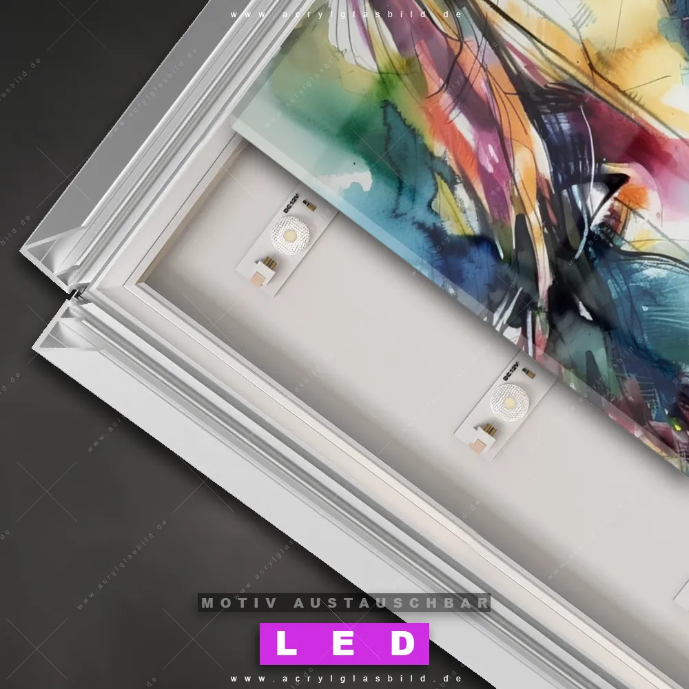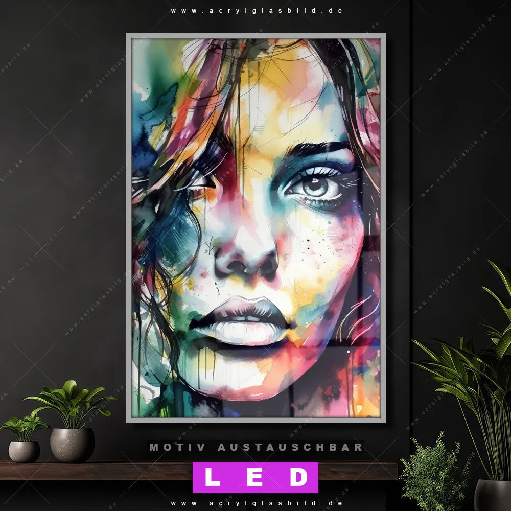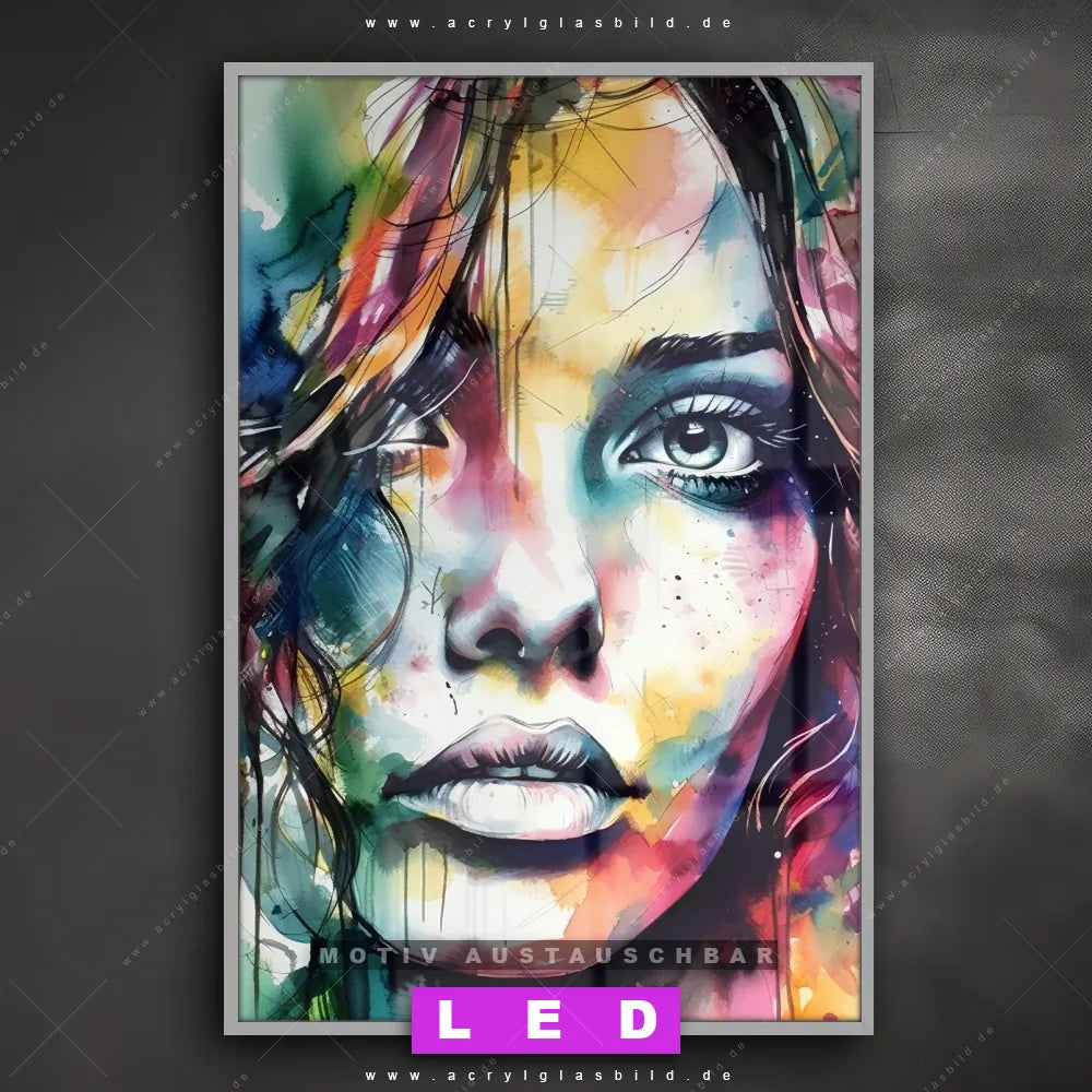 Wer braucht schon langweilige Wände, wenn man sie mit unserem LED Acrylglasbild Canvalight® DIA Abstrakte Schönheit in bunten Farben aufpeppen kann? Dank der genialen LED-Ausleuchtung wirst du in Wohnzimmer - Schlafzimmer, Bar - Gastronomie, Friseur - Beauty, Arzt - Praxis, Flur - Eingangsbereich nie wieder über deine eigenen Füße stolpern. Wenn du nach einem beleuchteten Wandbild aus Acrylglas mit Frau, Portrait, Gesicht, Mädchen, Dame, Schönheit, Farbe suchst, dann ist unser LED Acrylglasbild Gesicht einer Frau - Aquarell in den hammermäßigen Motiv-Farben Bunt genau das richtige LED Bild für dich. Im coolen Abstrakt, Modern Art Stil gestaltet, passt das LED Leuchtbild mit DIA-Klapprahmen und glänzender Front aus Acrylglas perfekt zu jedem Einrichtungsstil – sogar zu deinem chaotischen Kreativlabor!