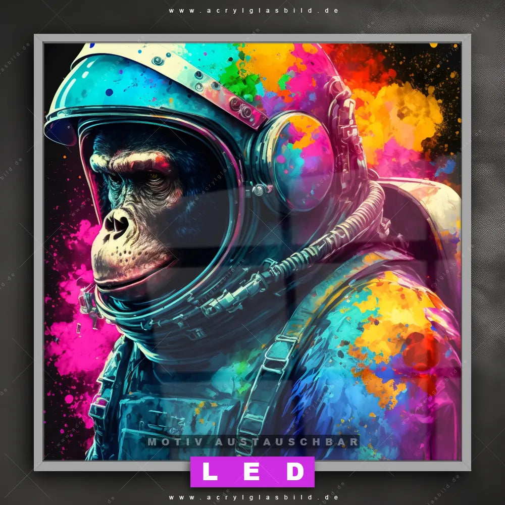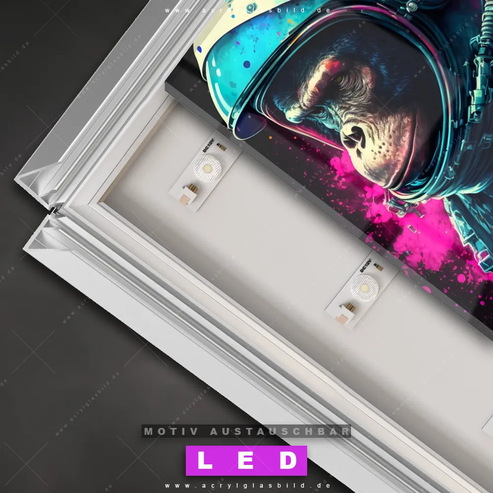 Also, worauf wartest du noch? Gib mit einem beleuchteten Wandbild mit wechselbarer Acrylglas-Scheibe deinen Wänden das gewisse Etwas und bestelle jetzt das LED Acrylglasbild Canvalight® DIA Bunter Affe als Astronaut – dein Zuhause wird es dir danken und deine Freunde werden dank der wechselbaren Motive erblassen!