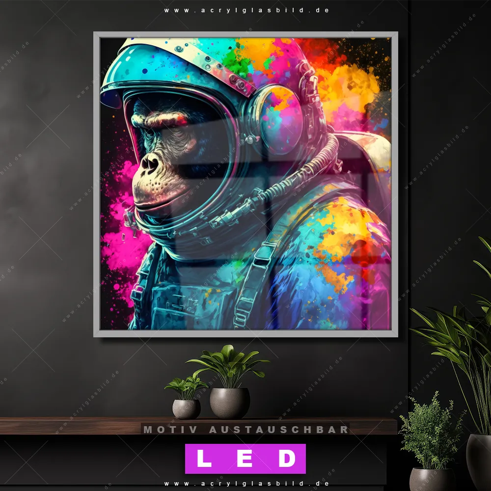 Bist du bereit, deine Wände mit einem dimmbaren LED Bild mit Fernbedienung und optionaler Farbtemperatursteuerung zum Leuchten zu bringen? Wir haben das ultimative Tierwelt LED Acrylglasbild Canvalight® DIA für dich! Unser LED Wandbild aus Acrylglas Space Monkey im Quadratischen Format mit austauschbarer bedruckter Acrylglas-Scheibe im DIA-Klapprahmen bringt sofort jede Menge Glanz in deine vier Wände.
