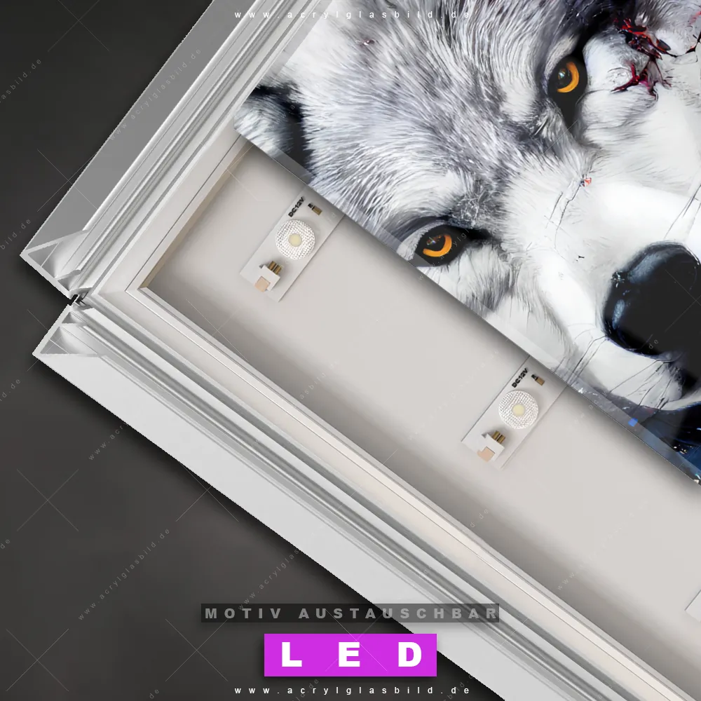 Also, worauf wartest du noch? Gib mit einem beleuchteten Wandbild mit wechselbarer Acrylglas-Scheibe deinen Wänden das gewisse Etwas und bestelle jetzt das LED Acrylglasbild Canvalight® DIA Wolfskopf umgeben von bunter Farbenpracht – dein Zuhause wird es dir danken und deine Freunde werden dank der wechselbaren Motive erblassen!