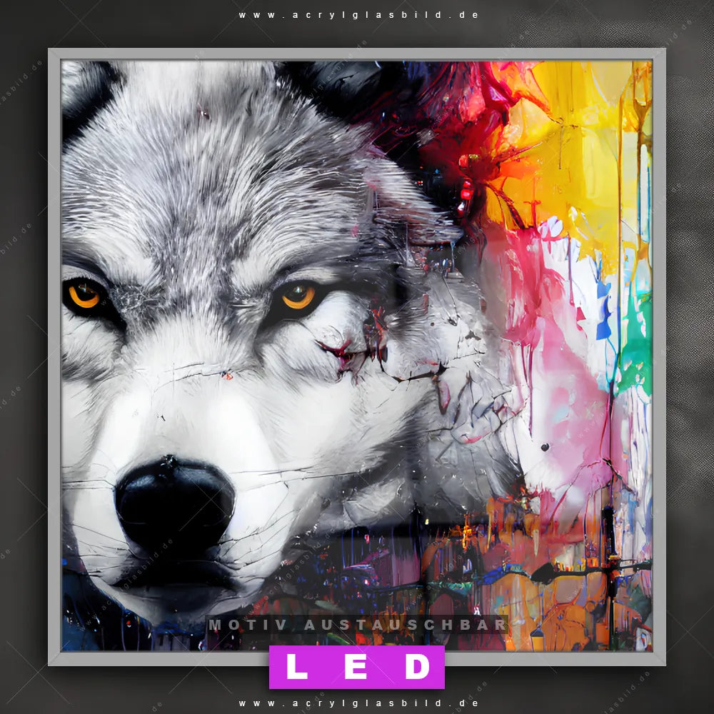 LED Acrylglasbild Canvalight® DIA | Wolf mit bunten Farbspritzern | Quadrat