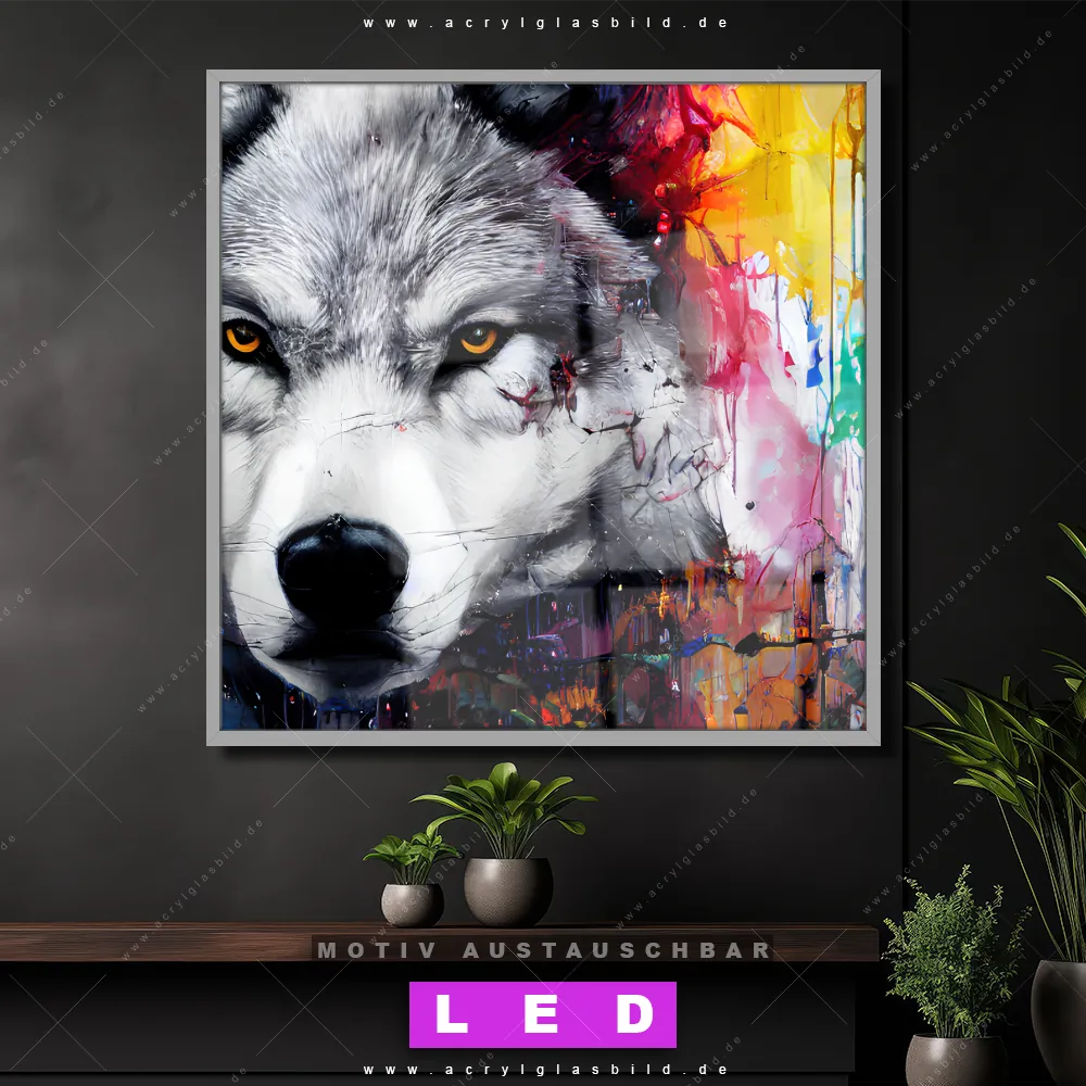 Bist du bereit, deine Wände mit einem dimmbaren LED Bild mit Fernbedienung und optionaler Farbtemperatursteuerung zum Leuchten zu bringen? Wir haben das ultimative Tierwelt LED Acrylglasbild Canvalight® DIA für dich! Unser LED Wandbild aus Acrylglas Wolf mit bunten Farbspritzern im Quadratischen Format mit austauschbarer bedruckter Acrylglas-Scheibe im DIA-Klapprahmen bringt sofort jede Menge Glanz in deine vier Wände.