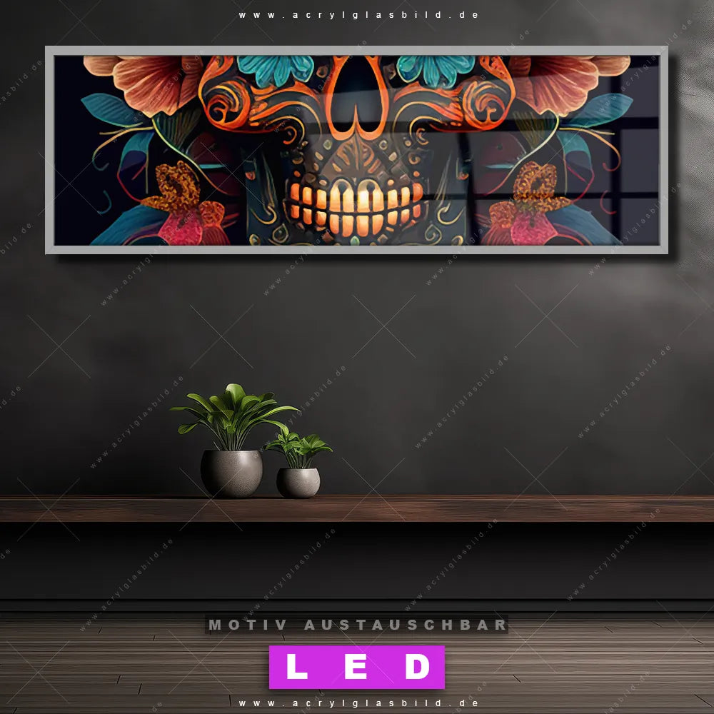 Wer will schon dunkle, triste Wände? Mit unserem LED Acrylglasbild Canvalight® DIA verzierter Totenkopf und seiner fantastischen LED-Ausleuchtung werden deine Wände in Bar - Gastronomie, Wohnzimmer - Schlafzimmer zu echten Hinguckern. Wenn du auf der Suche nach einem beleuchteten Wandbild aus Acrylglas mit Schädel, Totenkopf, Skelett, Skull, Knochen, Blumen, Blüten, Blätter bist, dann solltest du unser LED Leuchhtbild Totenkopf mit Blumen mit den beeindruckenden Motiv-Farben Gold, Schwarz, Rot, Türkis, Bunt, Orange nicht verpassen. Gestaltet im angesagten Modern Art, Floral Stil, passt das LED Bild mit DIA-Klapprahmen und wechselbarer Acrylglas-Scheibe perfekt zu jedem Einrichtungsstil – selbst in deinem kleinen Dschungel aus Kreativität und Chaos!