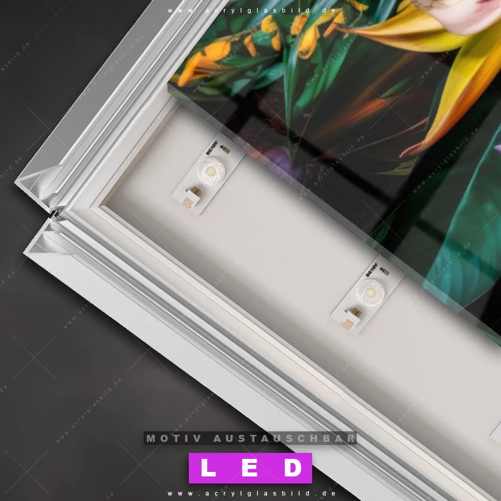 Wer will schon dunkle, triste Wände? Mit unserem LED Acrylglasbild Canvalight® DIA Dschungelpflanzen und seiner fantastischen LED-Ausleuchtung werden deine Wände in Arzt - Praxis, Wohnzimmer - Schlafzimmer, Flur - Eingangsbereich zu echten Hinguckern. Wenn du auf der Suche nach einem beleuchteten Wandbild aus Acrylglas mit Blätter, Pflanze, Natur, Laub, Dschungel, Blüten, Blumen bist, dann solltest du unser LED Leuchhtbild Exotische Blüten und Blätter mit den beeindruckenden Motiv-Farben Grün, Rot, Gelb , Blau nicht verpassen. Gestaltet im angesagten Floral, Modern Art Stil, passt das LED Bild mit DIA-Klapprahmen und wechselbarer Acrylglas-Scheibe perfekt zu jedem Einrichtungsstil – selbst in deinem kleinen Dschungel aus Kreativität und Chaos!