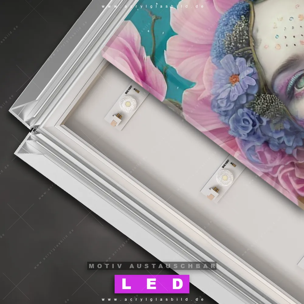 Du suchst nach einem Wandbild mit LED Beleuchtung als ultimativen Hingucker für deine Wände? Dann haben wir das perfekte dimmbare LED Bild mit Fernbedienung und optionaler Farbtemperatursteuerung für dich: unser abgefahrenes Porträts - Menschen, Blumen - Botanik Canvalight® DIA LED Acrylglasbild! Mit dem LED Leuchtbild aus Acrylglas Florales Frauenporträt - Miona im Hochformat mit austauschbarer bedruckter Acrylglas-Scheibe bringst du nicht nur Licht, sondern auch ordentlich Stil in deine Bude.