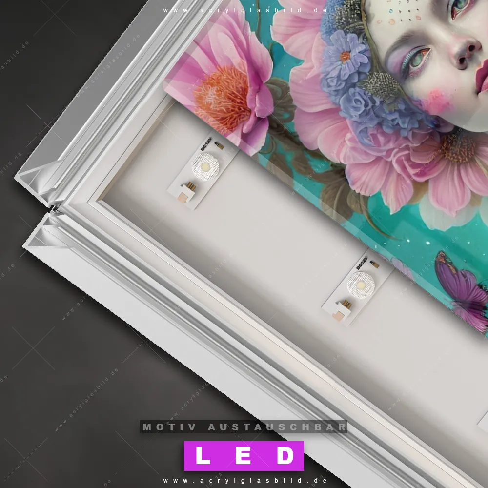 Also, worauf wartest du noch? Gib mit einem beleuchteten Wandbild mit wechselbarer Acrylglas-Scheibe deinen Wänden das gewisse Etwas und bestelle jetzt das LED Acrylglasbild Canvalight® DIA Blumenkranz im Haar einer Frau – dein Zuhause wird es dir danken und deine Freunde werden dank der wechselbaren Motive erblassen!