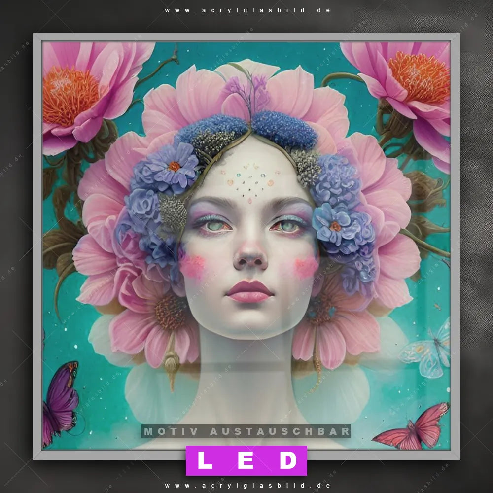 Bist du bereit, deine Wände mit einem dimmbaren LED Bild mit Fernbedienung und optionaler Farbtemperatursteuerung zum Leuchten zu bringen? Wir haben das ultimative Porträts - Menschen, Blumen - Botanik LED Acrylglasbild Canvalight® DIA für dich! Unser LED Wandbild aus Acrylglas Florales Frauenporträt - Miona im Quadratischen Format mit austauschbarer bedruckter Acrylglas-Scheibe im DIA-Klapprahmen bringt sofort jede Menge Glanz in deine vier Wände.
