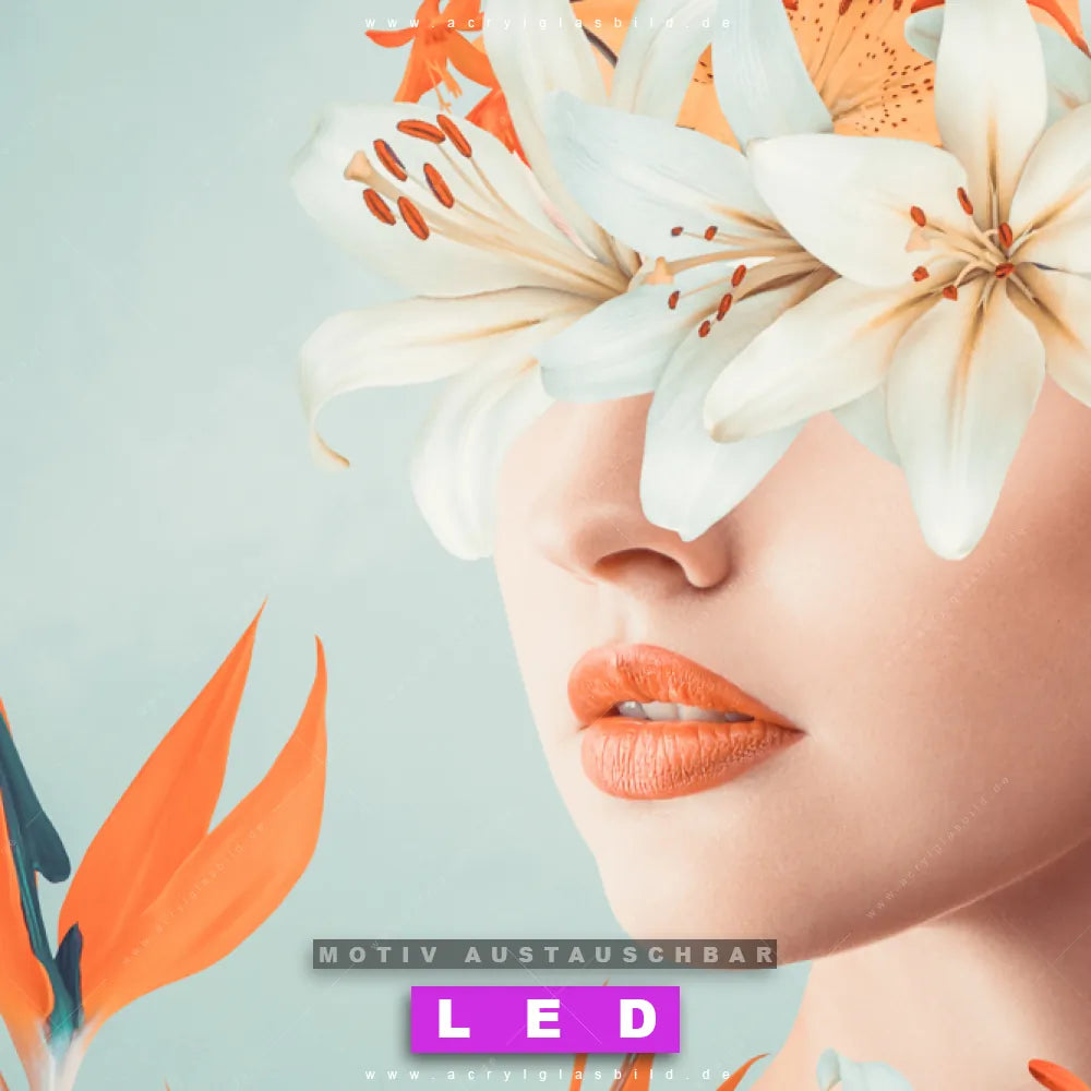 Wer braucht schon langweilige Wände, wenn man sie mit unserem LED Acrylglasbild Canvalight® DIA Schöne Frau umgeben von Blumen aufpeppen kann? Dank der genialen LED-Ausleuchtung wirst du in Bar - Gastronomie, Friseur - Beauty, Wohnzimmer - Schlafzimmer, Flur - Eingangsbereich nie wieder über deine eigenen Füße stolpern. Wenn du nach einem beleuchteten Wandbild aus Acrylglas mit Menschen & Blumen, Frau, Porträt, Gesicht, Blumen, Blüten, Frisur, Haare suchst, dann ist unser LED Acrylglasbild Florales, Abstraktes Frauengesicht in den hammermäßigen Motiv-Farben Orange, Hellblau, Weiss, Hellgrün genau das richtige LED Bild für dich. Im coolen Modern Art, Floral Stil gestaltet, passt das LED Leuchtbild mit DIA-Klapprahmen und glänzender Front aus Acrylglas perfekt zu jedem Einrichtungsstil – sogar zu deinem chaotischen Kreativlabor!