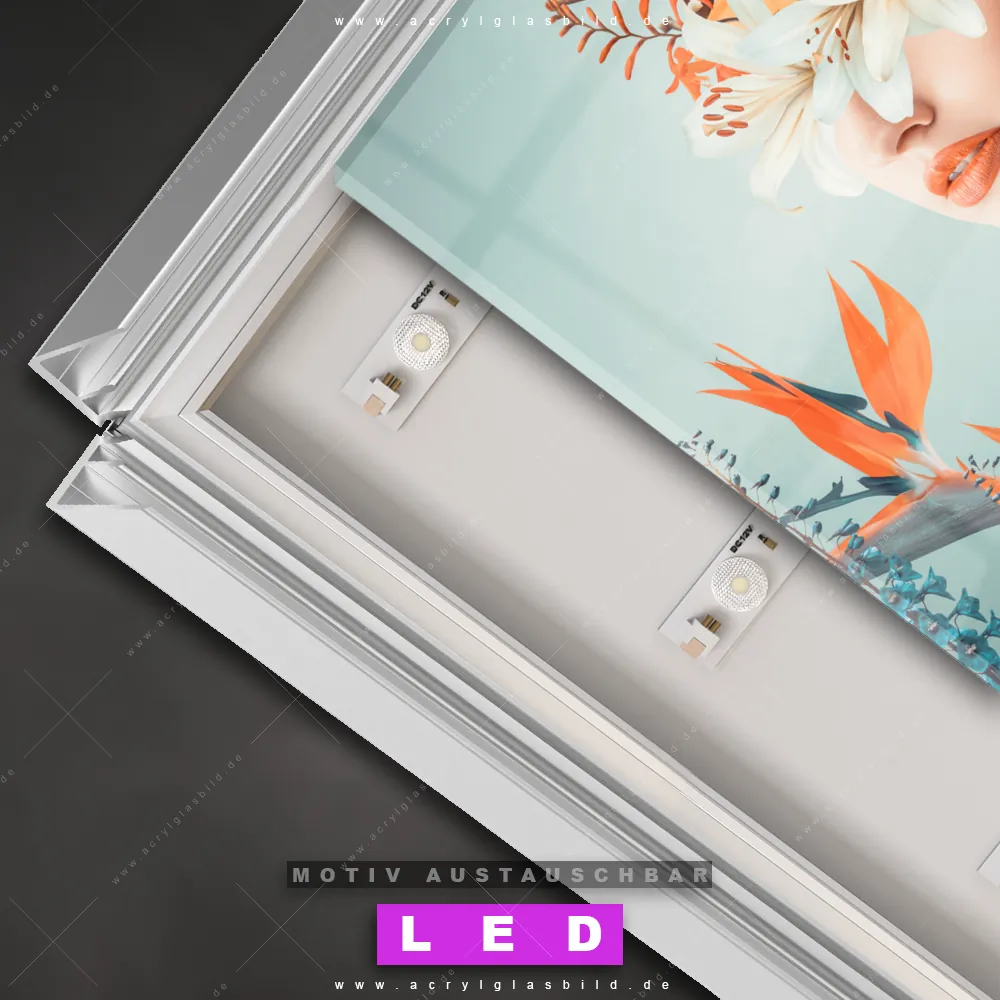 Also, worauf wartest du noch? Gib mit einem beleuchteten Wandbild mit wechselbarer Acrylglas-Scheibe deinen Wänden das gewisse Etwas und bestelle jetzt das LED Acrylglasbild Canvalight® DIA Blumen im Haar einer Frau – dein Zuhause wird es dir danken und deine Freunde werden dank der wechselbaren Motive erblassen!
