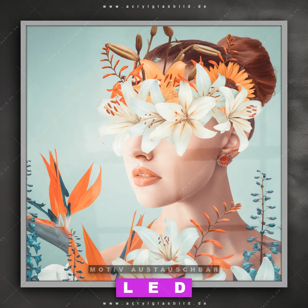 Bist du bereit, deine Wände mit einem dimmbaren LED Bild mit Fernbedienung und optionaler Farbtemperatursteuerung zum Leuchten zu bringen? Wir haben das ultimative Porträts - Menschen, Blumen - Botanik LED Acrylglasbild Canvalight® DIA für dich! Unser LED Wandbild aus Acrylglas Florales Frauenporträt - Viola im Quadratischen Format mit austauschbarer bedruckter Acrylglas-Scheibe im DIA-Klapprahmen bringt sofort jede Menge Glanz in deine vier Wände.