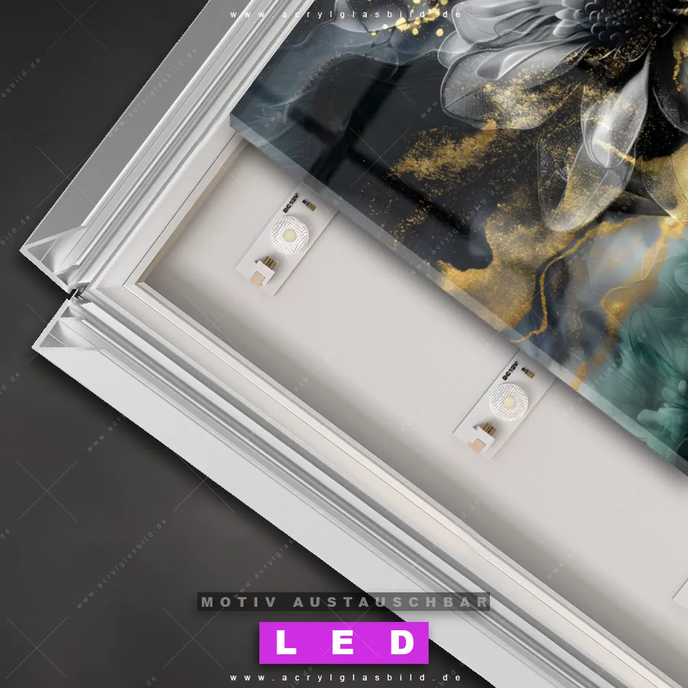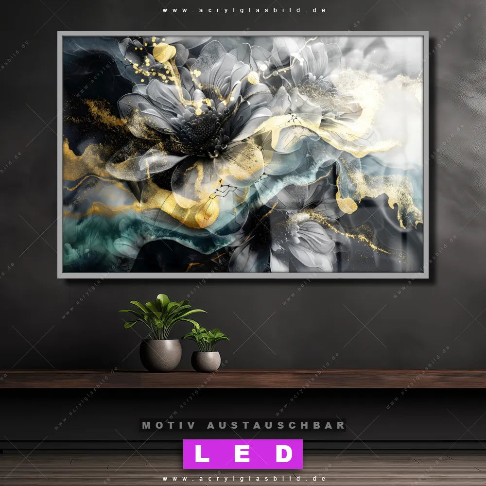Mit unserem LED Acrylglasbild Canvalight® DIA Dunkle Blumen und seiner genialen LED-Ausleuchtung wirst du nie wieder im Dunkeln auf deinem Sofa herumtappen. Wenn du nach einem beleuchteten Wandbild aus Acrylglas mit Blumen, Pflanze, Natur, Blüten, Glitzer, Farbspritzer, Fluid Art für Wohnzimmer - Schlafzimmer, Arzt - Praxis, Flur - Eingangsbereich suchst, ist unser LED Leuchtbild Florales abstraktes Design in den beeindruckenden Motiv-Farben Schwarz, Grau , Gold, Türkis genau das richtige beleuchtete Wandbild für dich. Gestaltet im Abstrakt, Floral, Modern Art Stil, passt dieses LED Wandbild mit DIA-Klapprahmen und glänzender Front aus Acrylglas perfekt zu jedem Einrichtungsstil – sogar zu deinem chaotischen kreativen Durcheinander!