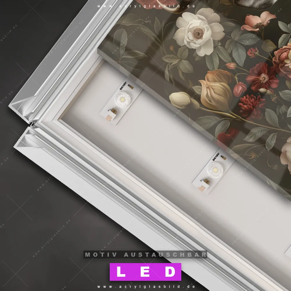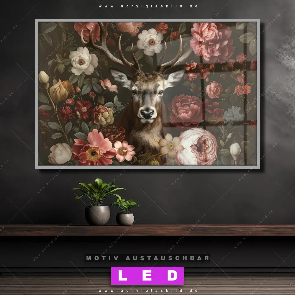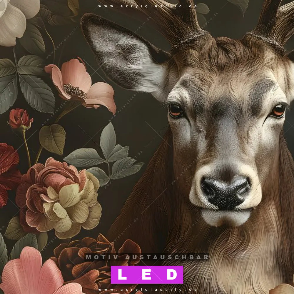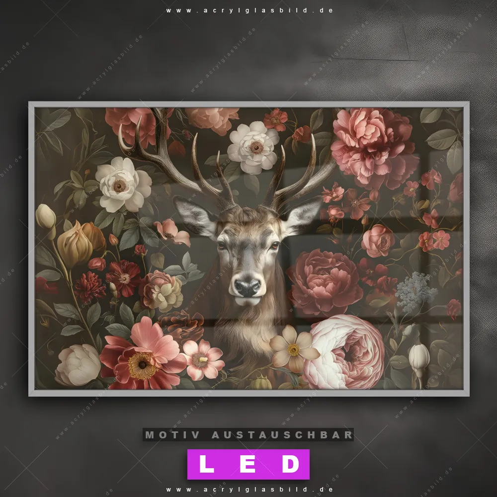 Mit unserem LED Acrylglasbild Canvalight® DIA Florales Hirsch-Porträt und seiner genialen LED-Ausleuchtung wirst du nie wieder im Dunkeln auf deinem Sofa herumtappen. Wenn du nach einem beleuchteten Wandbild aus Acrylglas mit Tierporträt, Hirsch, Blüten, Rotwild, Geweih, Blumen, Rothirsch, Pfingstrosen für Wohnzimmer - Schlafzimmer, Arzt - Praxis, Flur - Eingangsbereich suchst, ist unser LED Leuchtbild Rotwild umgeben von Blumen in den beeindruckenden Motiv-Farben Braun, Weiss, Rot genau das richtige beleuchtete Wandbild für dich. Gestaltet im Retro - Vintage, Floral Stil, passt dieses LED Wandbild mit DIA-Klapprahmen und glänzender Front aus Acrylglas perfekt zu jedem Einrichtungsstil – sogar zu deinem chaotischen kreativen Durcheinander!
