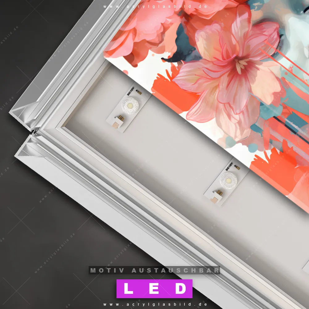 Wer braucht schon langweilige Wände, wenn man sie mit unserem LED Acrylglasbild Canvalight® DIA Schönes Mädchen mit Blumenfrisur aufpeppen kann? Dank der genialen LED-Ausleuchtung wirst du in Bar - Gastronomie, Friseur - Beauty, Wohnzimmer - Schlafzimmer, Flur - Eingangsbereich nie wieder über deine eigenen Füße stolpern. Wenn du nach einem beleuchteten Wandbild aus Acrylglas mit Menschen & Blumen, Frau, Porträt, Gesicht, Blumen, Blüten, Frisur, Haare suchst, dann ist unser LED Acrylglasbild Blumiges Frauenporträt in den hammermäßigen Motiv-Farben Rot, Blau, Rosa, Grau genau das richtige LED Bild für dich. Im coolen Modern Art, Floral Stil gestaltet, passt das LED Leuchtbild mit DIA-Klapprahmen und glänzender Front aus Acrylglas perfekt zu jedem Einrichtungsstil – sogar zu deinem chaotischen Kreativlabor!
