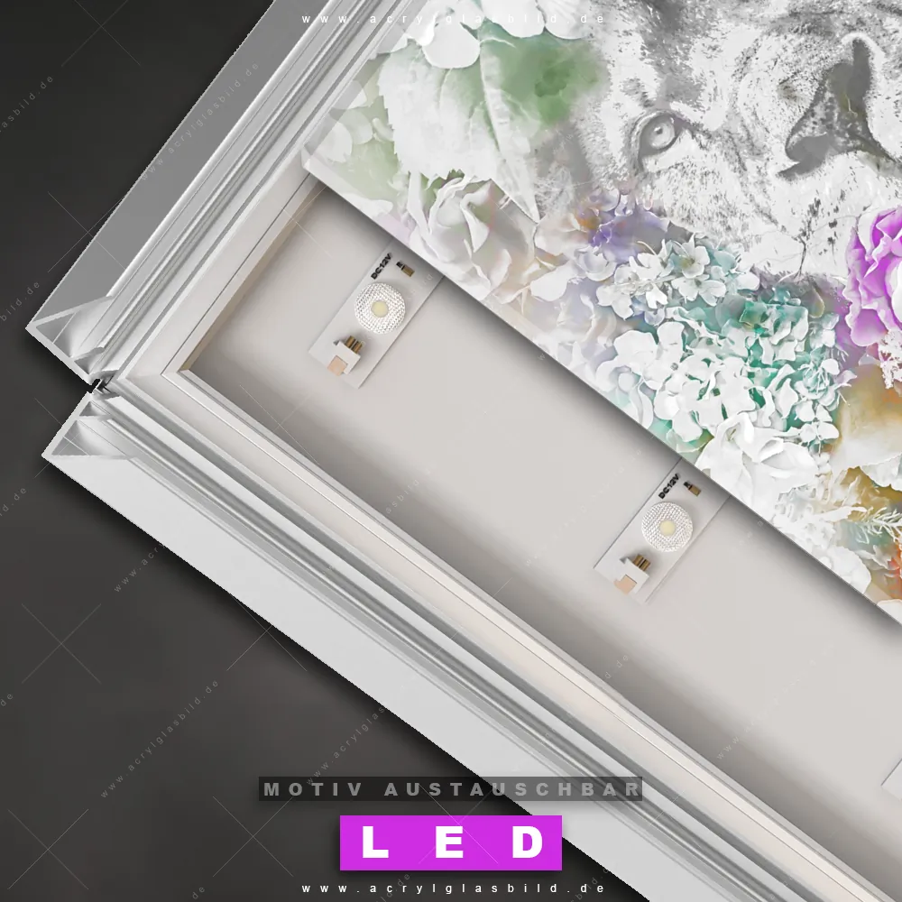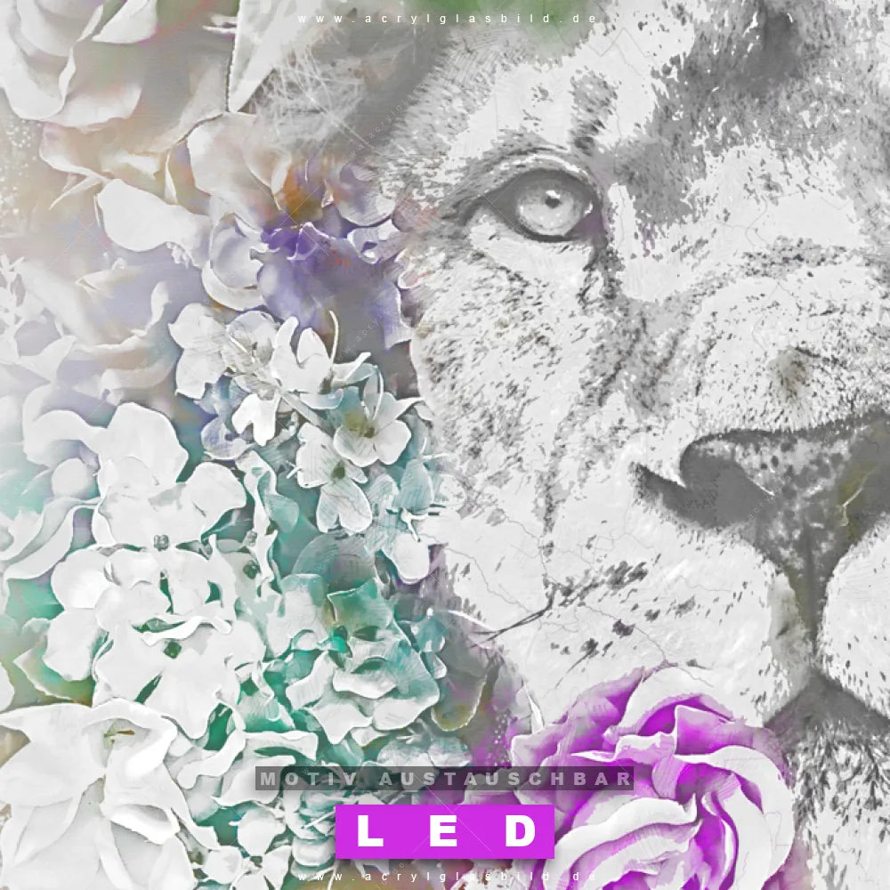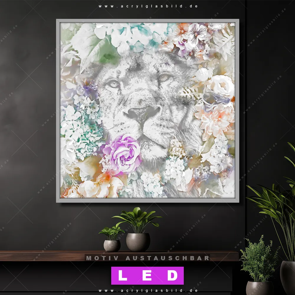 Bist du bereit, deine Wände mit einem dimmbaren LED Bild mit Fernbedienung und optionaler Farbtemperatursteuerung zum Leuchten zu bringen? Wir haben das ultimative Tierwelt, Blumen - Botanik LED Acrylglasbild Canvalight® DIA für dich! Unser LED Wandbild aus Acrylglas Löwe & Blumen im Quadratischen Format mit austauschbarer bedruckter Acrylglas-Scheibe im DIA-Klapprahmen bringt sofort jede Menge Glanz in deine vier Wände.