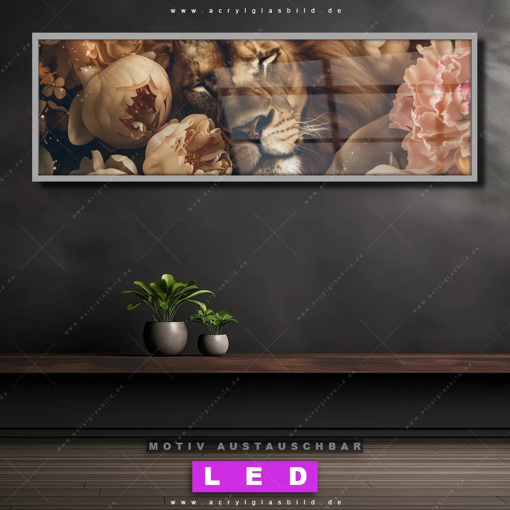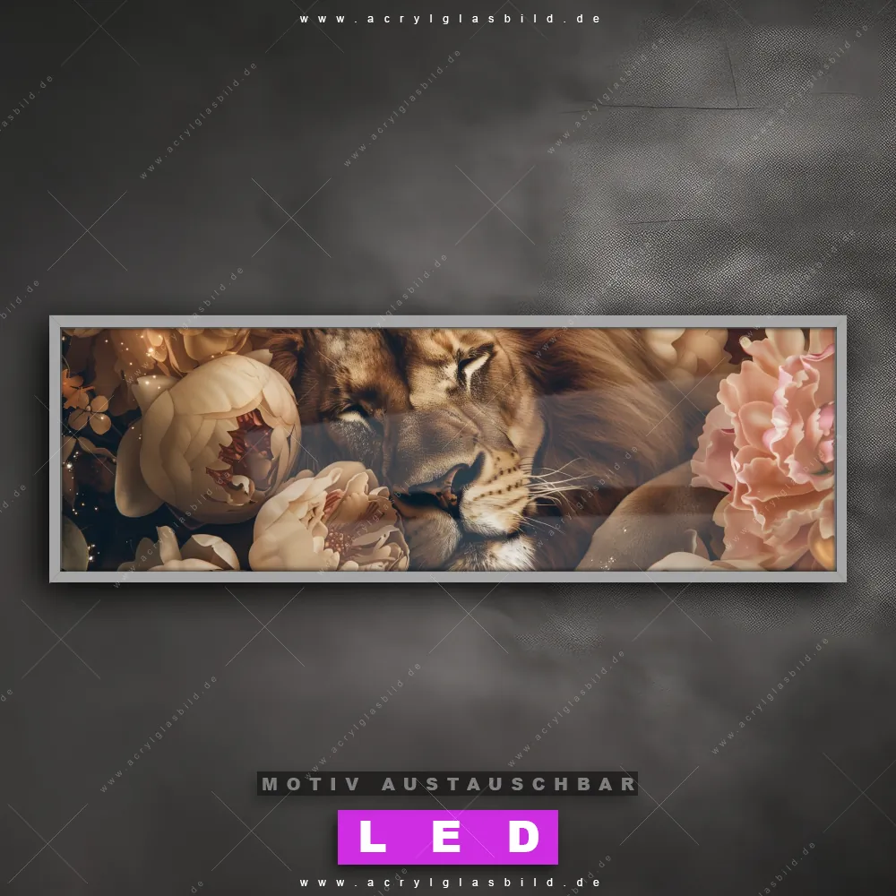 LED Acrylglasbild Canvalight® DIA | Löwe schläft in Blüten | Panorama