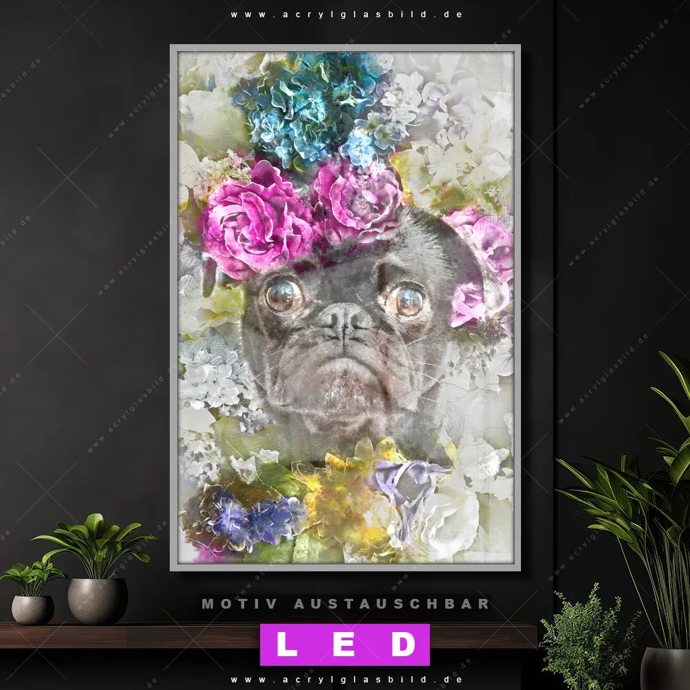 Du suchst nach einem Wandbild mit LED Beleuchtung als ultimativen Hingucker für deine Wände? Dann haben wir das perfekte dimmbare LED Bild mit Fernbedienung und optionaler Farbtemperatursteuerung für dich: unser abgefahrenes Tierwelt, Blumen - Botanik Canvalight® DIA LED Acrylglasbild! Mit dem LED Leuchtbild aus Acrylglas Mops & Blumen im Hochformat mit austauschbarer bedruckter Acrylglas-Scheibe bringst du nicht nur Licht, sondern auch ordentlich Stil in deine Bude.