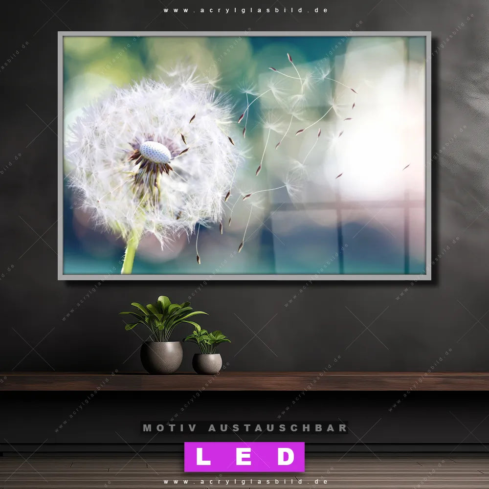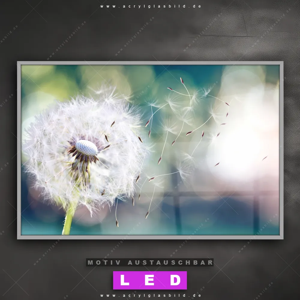 Du bist auf der Suche nach einem dimmbaren Blumen - Botanik LED Bild mit Fernbedienung und optionaler Farbtemperatursteuerung? Dann haben wir hier genau das richtige Wandbild mit LED Beleuchtung für dich: Unser Canvalight® DIA LED Acrylglasbild Pusteblume No. 3 im Querformat mit austauschbarer bedruckter Acrylglas-Scheibe. Dieses Leuchtbild bringt sofort Partybeleuchtung in deine Räume!