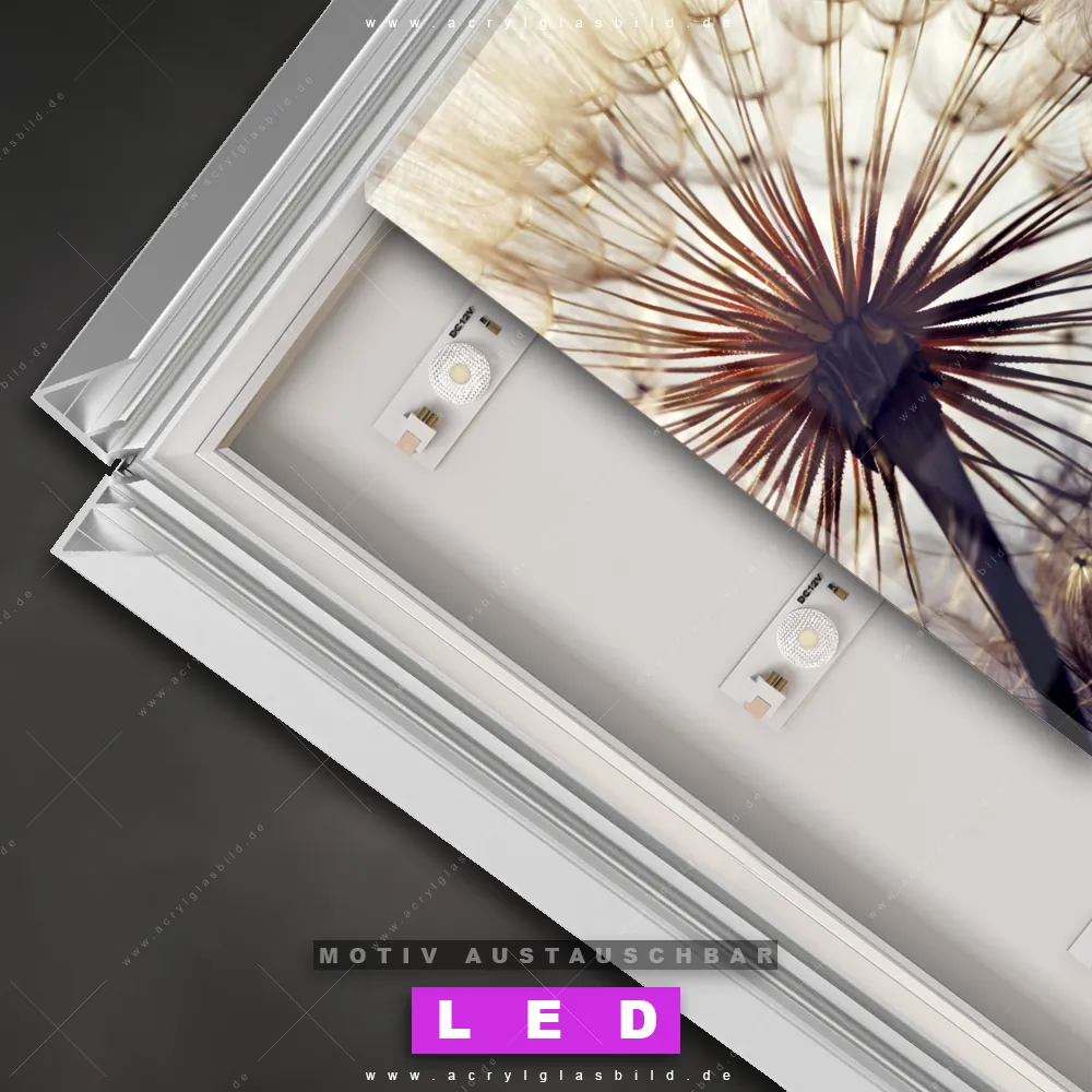Also, worauf wartest du noch? Gib mit einem beleuchteten Wandbild mit wechselbarer Acrylglas-Scheibe deinen Wänden das gewisse Etwas und bestelle jetzt das LED Acrylglasbild Canvalight® DIA Löwenzahn verblüht – dein Zuhause wird es dir danken und deine Freunde werden dank der wechselbaren Motive erblassen!