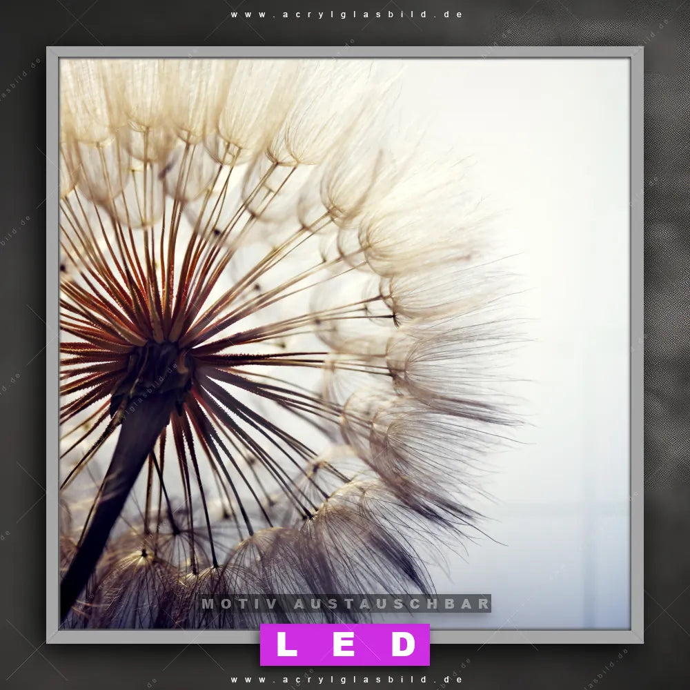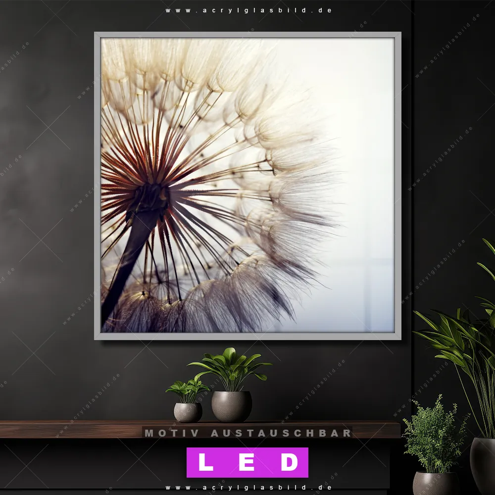 Bist du bereit, deine Wände mit einem dimmbaren LED Bild mit Fernbedienung und optionaler Farbtemperatursteuerung zum Leuchten zu bringen? Wir haben das ultimative Blumen - Botanik LED Acrylglasbild Canvalight® DIA für dich! Unser LED Wandbild aus Acrylglas Pusteblume im Quadratischen Format mit austauschbarer bedruckter Acrylglas-Scheibe im DIA-Klapprahmen bringt sofort jede Menge Glanz in deine vier Wände.
