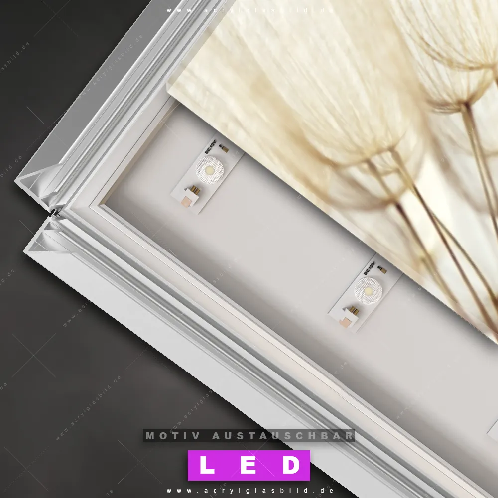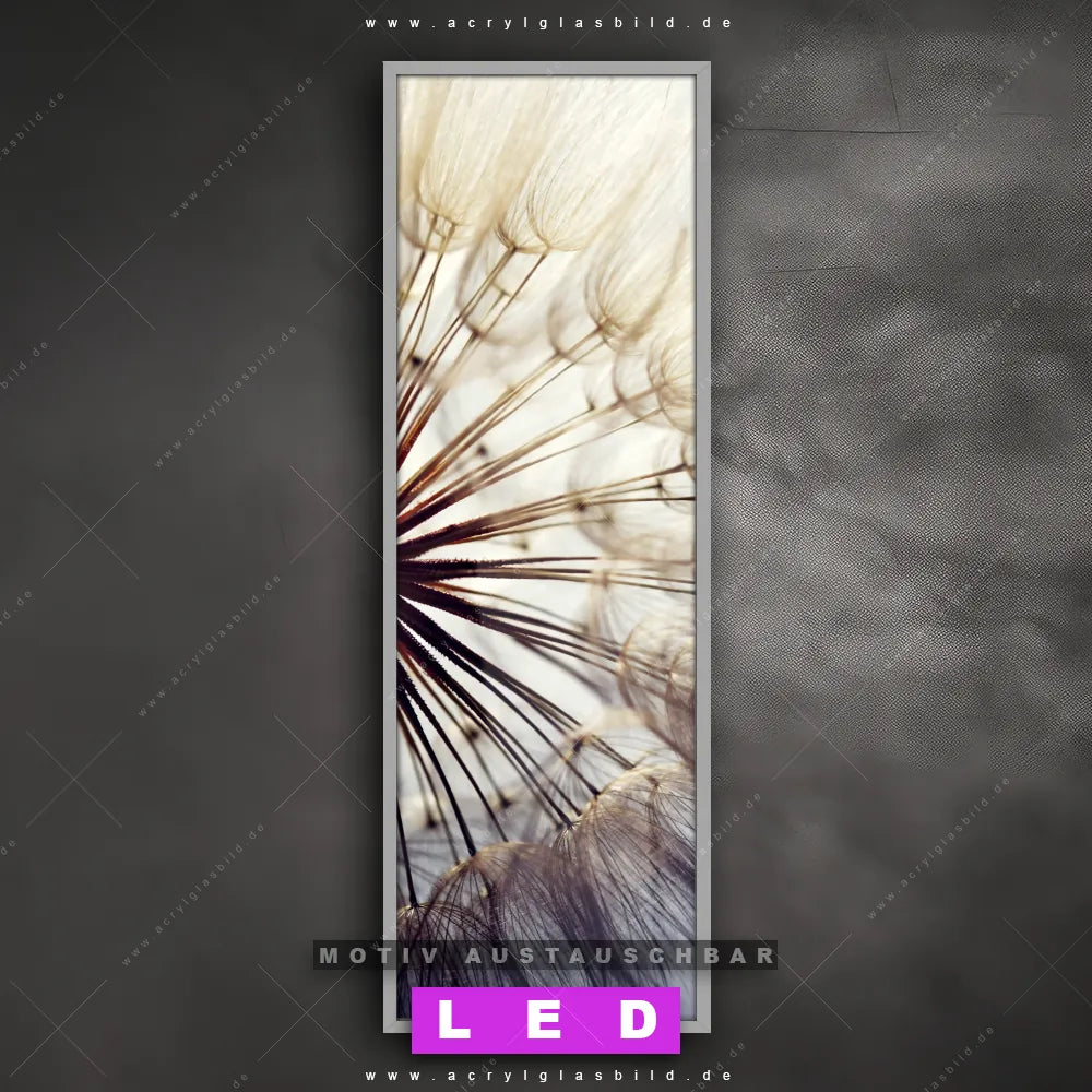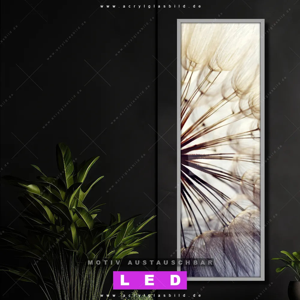 Bist du bereit, deine Wände mit einem dimmbaren LED Bild mit Fernbedienung und optionaler Farbtemperatursteuerung auf das nächste Level zu bringen? Unser Blumen - Botanik Canvalight® DIA LED Acrylglasbild ist genau das, was du brauchst! Das Wandbild mit LED Beleuchtung im Schmalen Format mit austauschbarer bedruckter Acrylglas-Scheibe Pusteblume bringt Licht und Stil in dein Zuhause – und das in null Komma nichts!