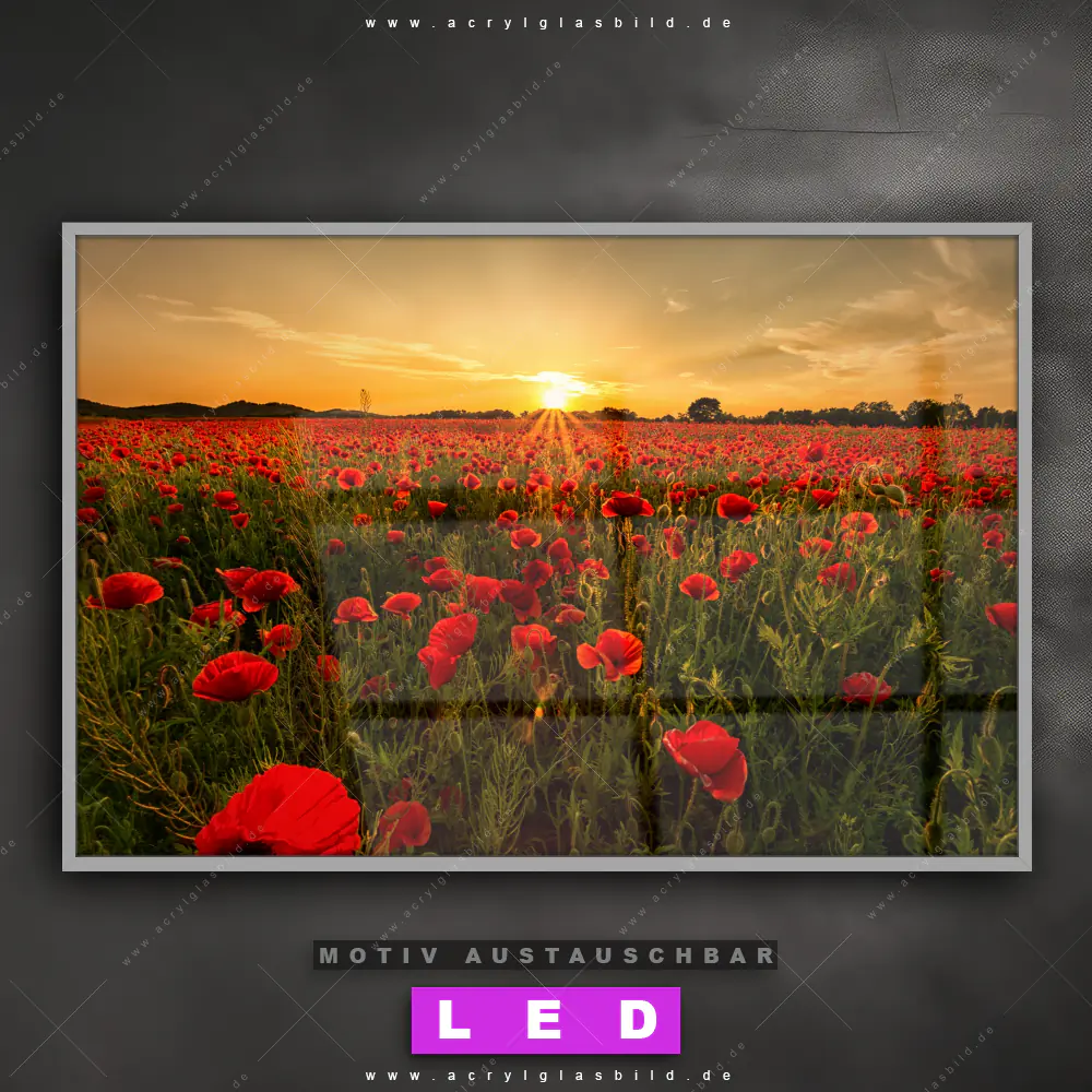 Du bist auf der Suche nach einem dimmbaren Landschaften, Blumen - Botanik LED Bild mit Fernbedienung und optionaler Farbtemperatursteuerung? Dann haben wir hier genau das richtige Wandbild mit LED Beleuchtung für dich: Unser Canvalight® DIA LED Acrylglasbild Sommerlandschaft mit rotem Mohn im Querformat mit austauschbarer bedruckter Acrylglas-Scheibe. Dieses Leuchtbild bringt sofort Partybeleuchtung in deine Räume!