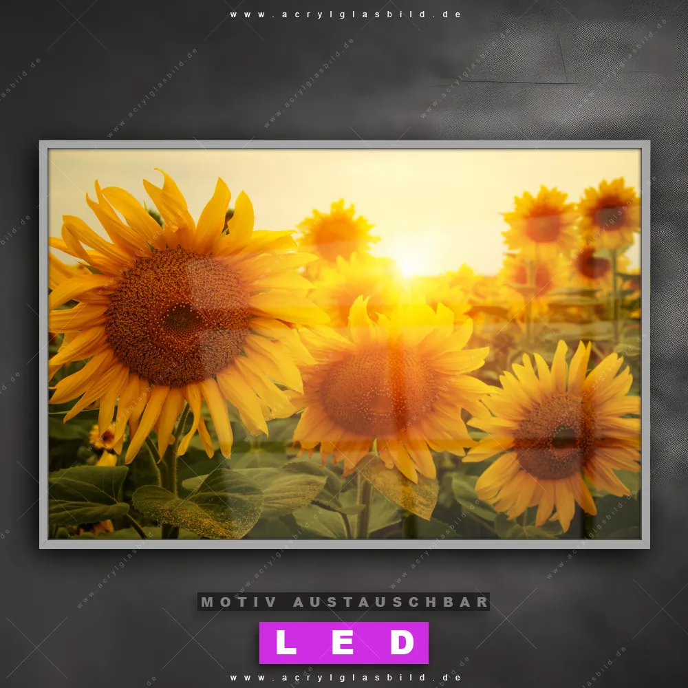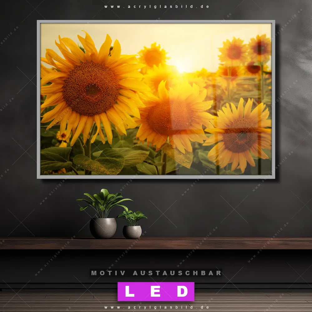 Du bist auf der Suche nach einem dimmbaren Landschaften, Blumen - Botanik LED Bild mit Fernbedienung und optionaler Farbtemperatursteuerung? Dann haben wir hier genau das richtige Wandbild mit LED Beleuchtung für dich: Unser Canvalight® DIA LED Acrylglasbild Sonnenblumen im Abendlicht im Querformat mit austauschbarer bedruckter Acrylglas-Scheibe. Dieses Leuchtbild bringt sofort Partybeleuchtung in deine Räume!