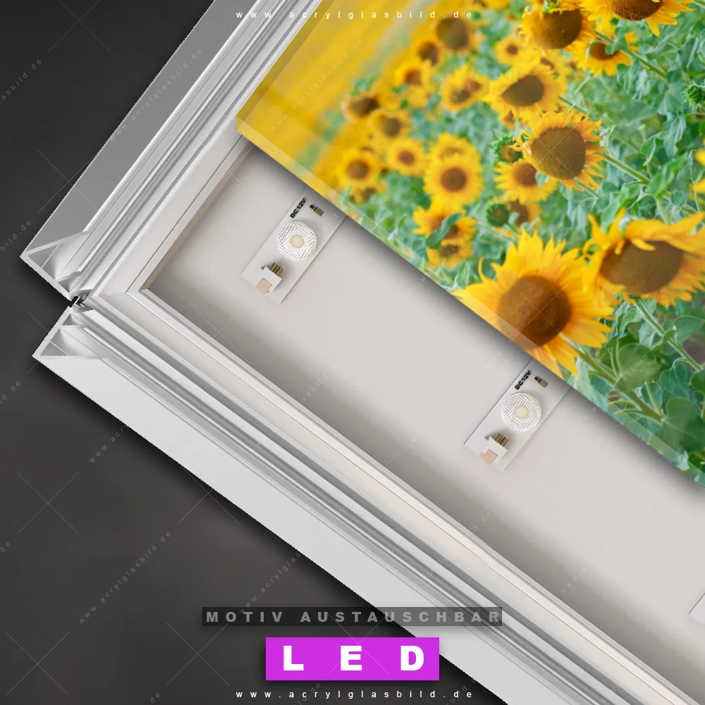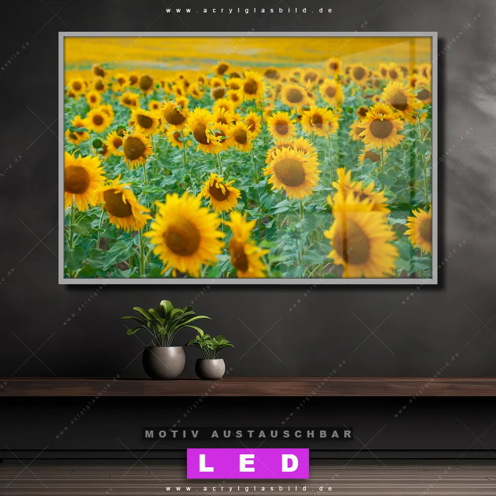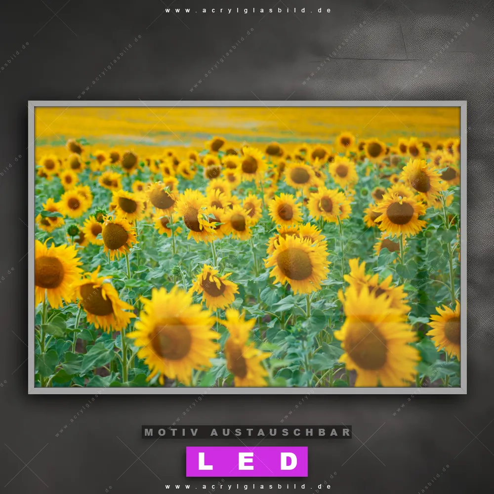Du bist auf der Suche nach einem dimmbaren Landschaften, Blumen - Botanik LED Bild mit Fernbedienung und optionaler Farbtemperatursteuerung? Dann haben wir hier genau das richtige Wandbild mit LED Beleuchtung für dich: Unser Canvalight® DIA LED Acrylglasbild Sonnenblumenfeld im Querformat mit austauschbarer bedruckter Acrylglas-Scheibe. Dieses Leuchtbild bringt sofort Partybeleuchtung in deine Räume!