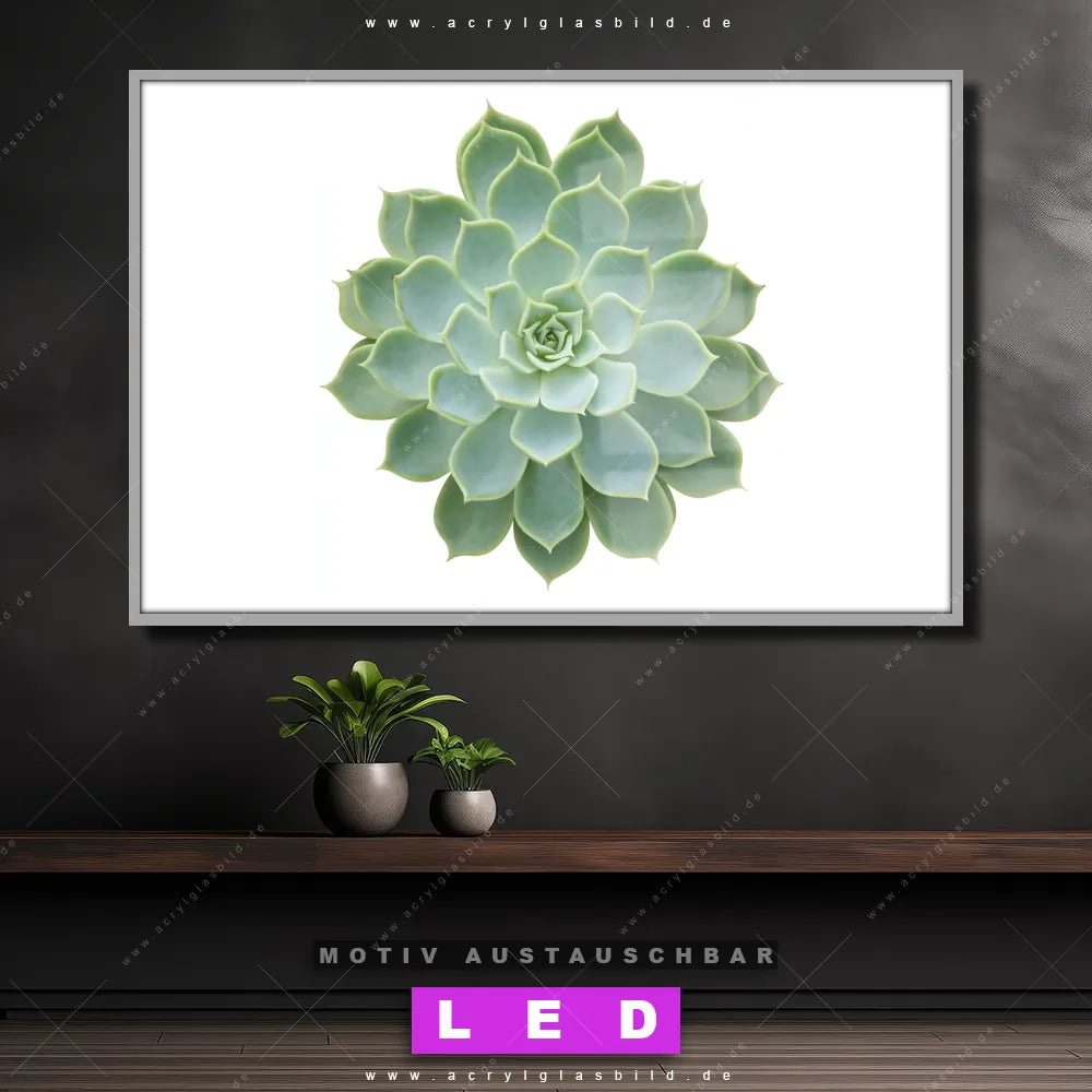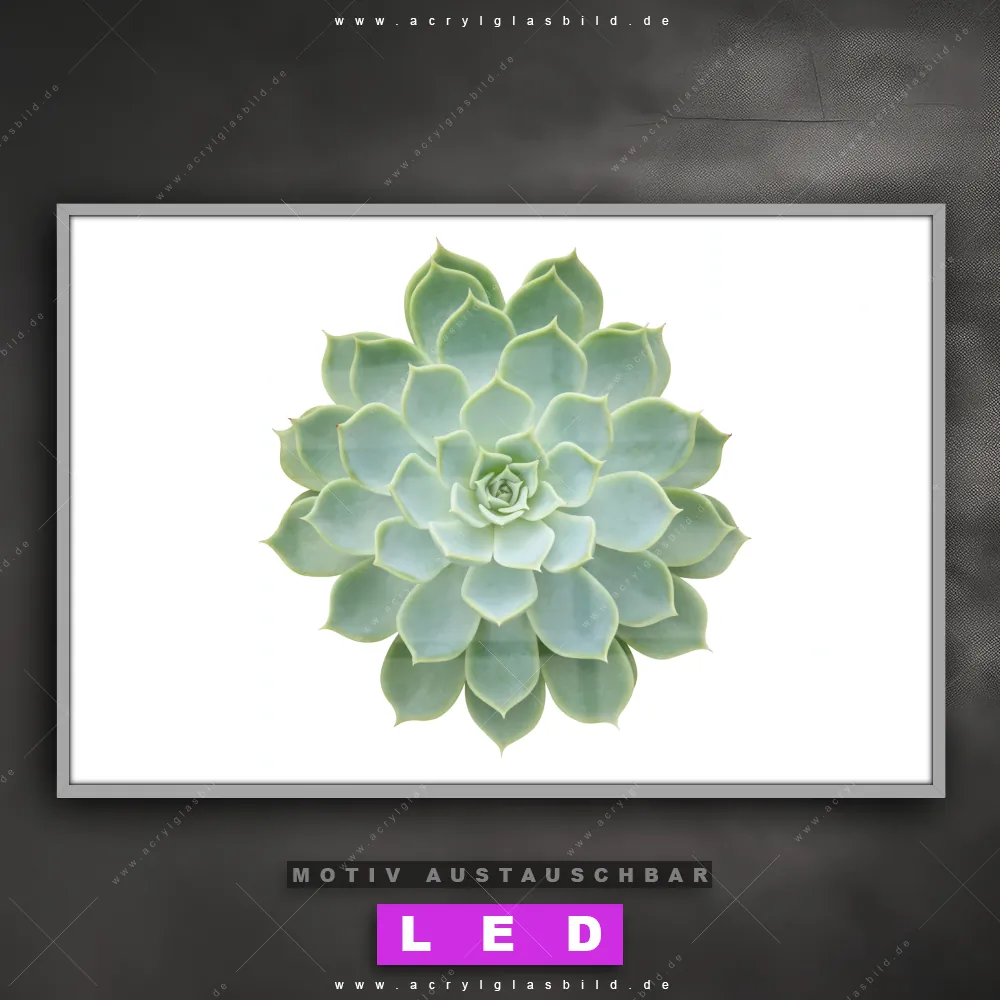 Du bist auf der Suche nach einem dimmbaren Blumen - Botanik LED Bild mit Fernbedienung und optionaler Farbtemperatursteuerung? Dann haben wir hier genau das richtige Wandbild mit LED Beleuchtung für dich: Unser Canvalight® DIA LED Acrylglasbild Sukkulente No.2 im Querformat mit austauschbarer bedruckter Acrylglas-Scheibe. Dieses Leuchtbild bringt sofort Partybeleuchtung in deine Räume!