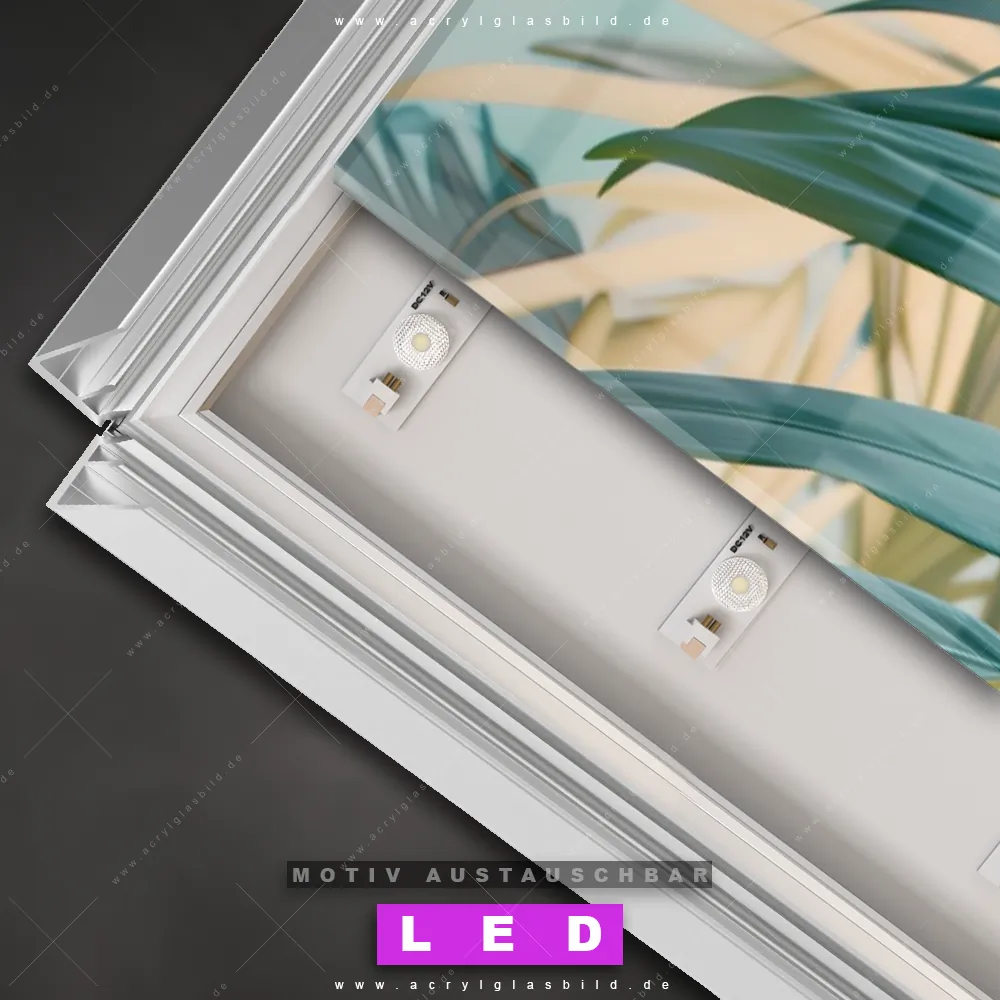 Bist du bereit, deine Wände mit einem dimmbaren LED Bild mit Fernbedienung und optionaler Farbtemperatursteuerung auf das nächste Level zu bringen? Unser Blumen - Botanik, Muster - Texturen Canvalight® DIA LED Acrylglasbild ist genau das, was du brauchst! Das Wandbild mit LED Beleuchtung im Schmalen Format mit austauschbarer bedruckter Acrylglas-Scheibe Tropische Blätter in Pastellfarben bringt Licht und Stil in dein Zuhause – und das in null Komma nichts!