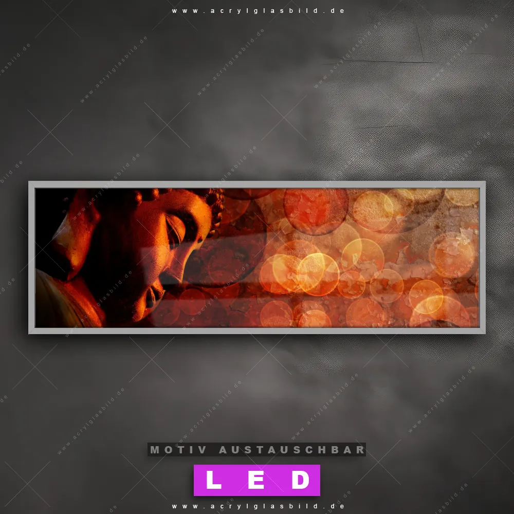 Wer will schon dunkle, triste Wände? Mit unserem LED Acrylglasbild Canvalight® DIA seitlicher Buddha und seiner fantastischen LED-Ausleuchtung werden deine Wände in Arzt - Praxis, Wohnzimmer - Schlafzimmer, Friseur - Beauty, Flur - Eingangsbereich, Büro - Kanzlei zu echten Hinguckern. Wenn du auf der Suche nach einem beleuchteten Wandbild aus Acrylglas mit Buddha, Buddhismus, Religion, Feng Shui, Zen, Meditation bist, dann solltest du unser LED Leuchhtbild Oberkörper Buddha in warmen Farbtönen mit den beeindruckenden Motiv-Farben Orange, Rot, Gold, Gelb nicht verpassen. Gestaltet im angesagten Mixed Media, Modern Art Stil, passt das LED Bild mit DIA-Klapprahmen und wechselbarer Acrylglas-Scheibe perfekt zu jedem Einrichtungsstil – selbst in deinem kleinen Dschungel aus Kreativität und Chaos!
