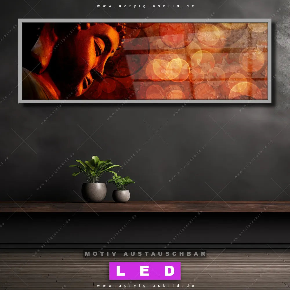 Deine Wände könnten dringend ein dimmbares LED Bild mit Fernbedienung und optionaler Farbtemperatursteuerung gebrauchen? Dann haben wir das perfekte Wandbild mit LED Beleuchtung für dich: unser mega-cooles Buddha - Feng Shui Canvalight® DIA LED Acrylglasbild! Mit unserem angesagten Leuchtbild aus Acrylglas im Panorama-Format und der austauschbaren bedruckten Acrylglas-Scheibe Bronze Zen Buddha bringst du nicht nur Licht, sondern auch jede Menge Flair in deine Räume.