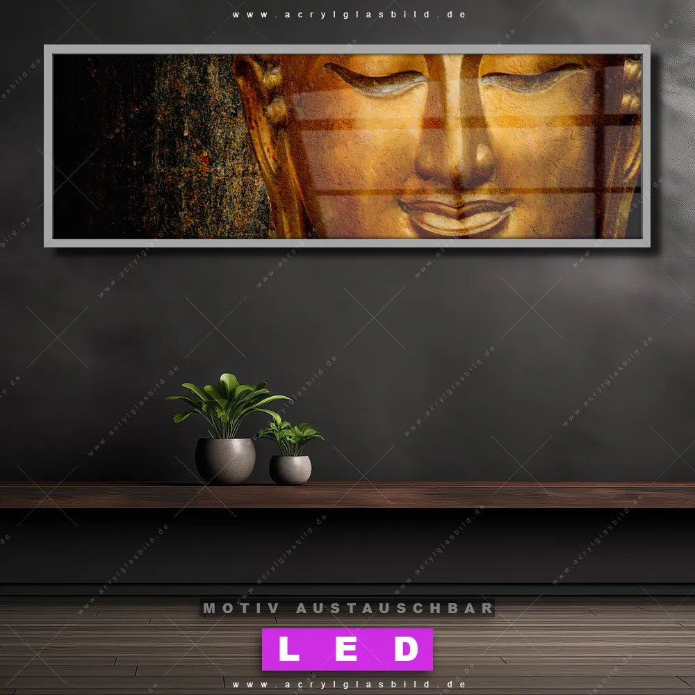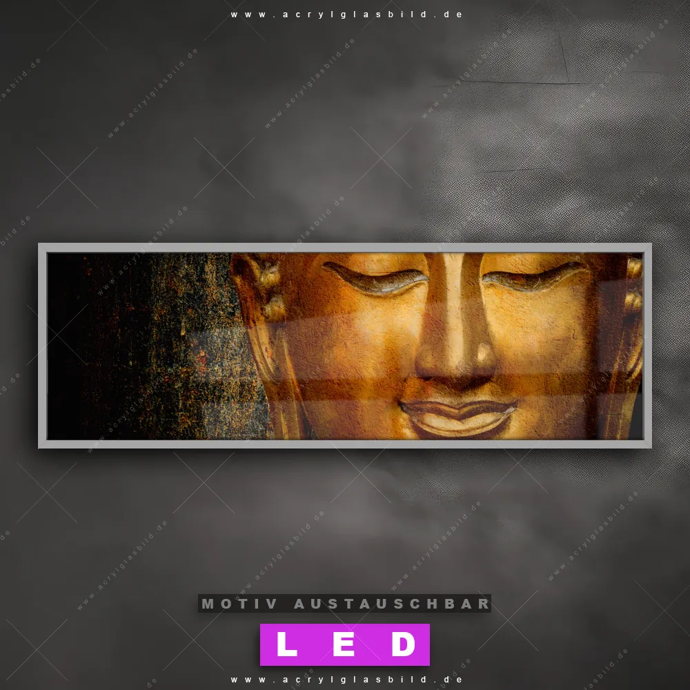 LED Acrylglasbild Canvalight® DIA | Lächelnder Buddha in Gold | Panorama