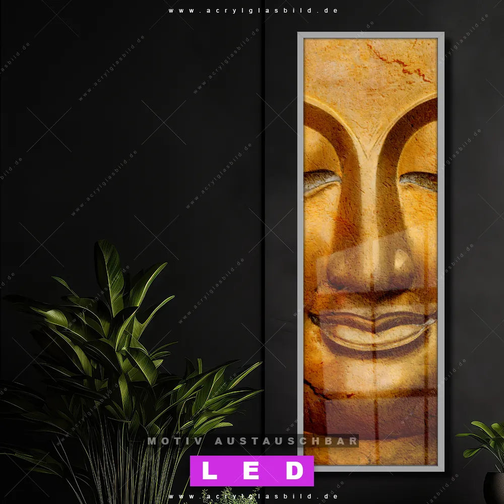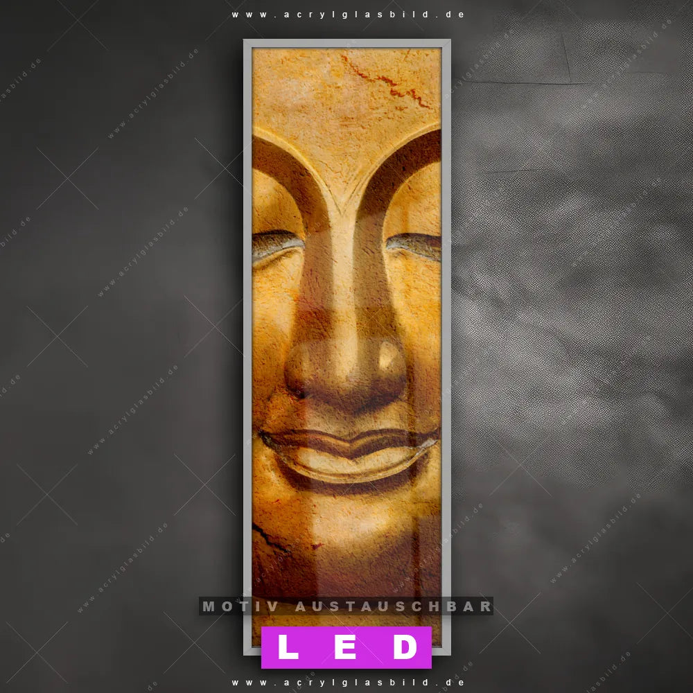 Bist du bereit, deine Wände mit einem dimmbaren LED Bild mit Fernbedienung und optionaler Farbtemperatursteuerung auf das nächste Level zu bringen? Unser Buddha - Feng Shui Canvalight® DIA LED Acrylglasbild ist genau das, was du brauchst! Das Wandbild mit LED Beleuchtung im Schmalen Format mit austauschbarer bedruckter Acrylglas-Scheibe Lächelnder Buddha in Gold bringt Licht und Stil in dein Zuhause – und das in null Komma nichts!