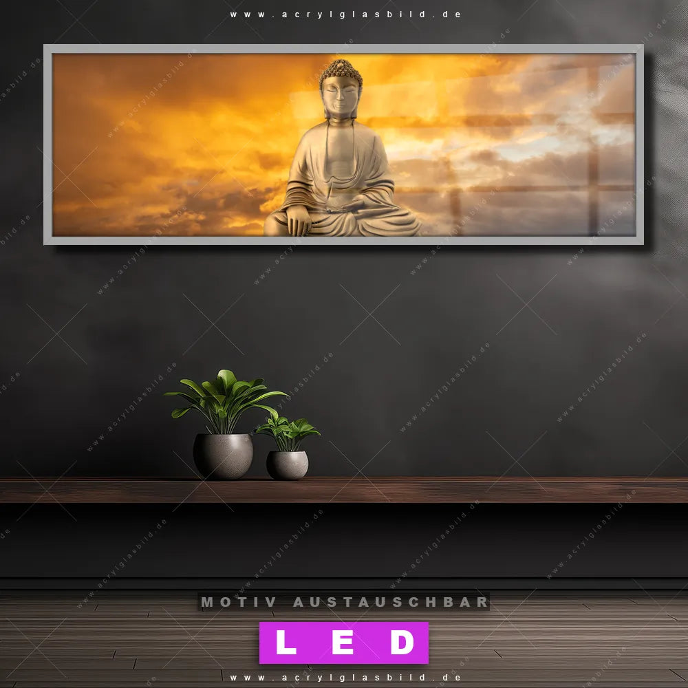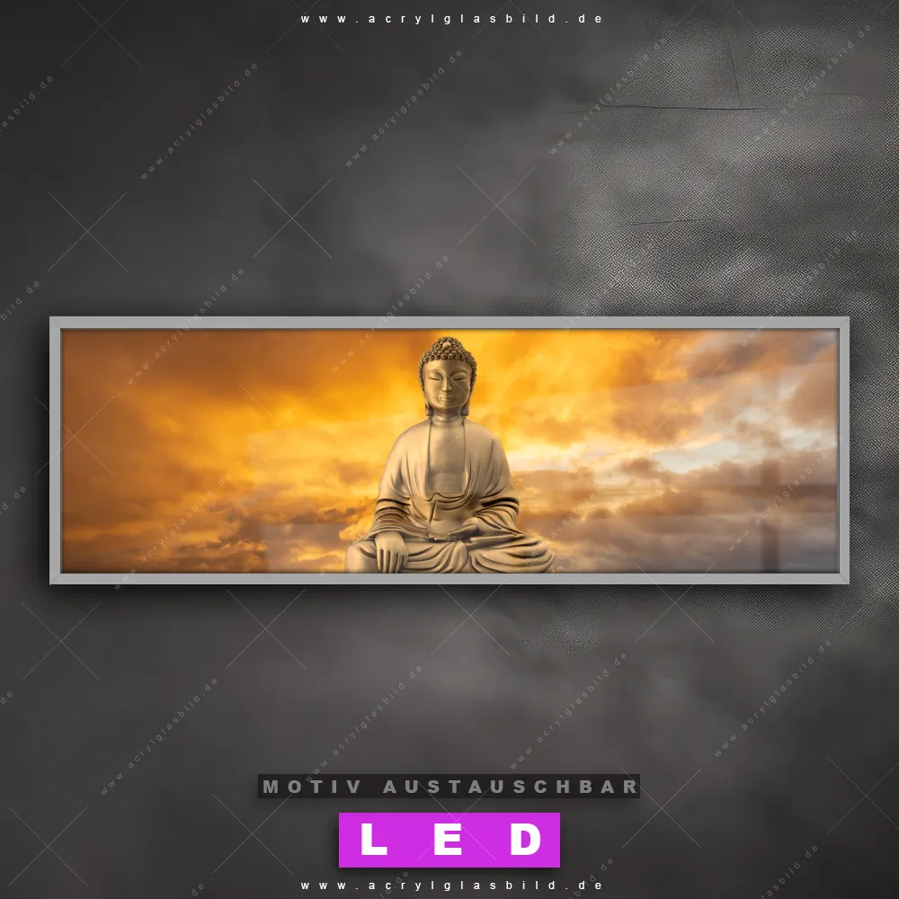 Begriffe wie Buddha, Buddhismus, Religion, Feng Shui, Zen, Meditation, Licht, Erleuchtung, Sonnenlicht, Sonnenuntergang, Spiegelung, Skulptur haben dich auf der Suche nach deinem neuen LED Wandbild aus Acrylglas inspiriert? Dann sollte das LED Acrylglasbild Buddha meditiert auf Wasser den Weg zu dir finden.