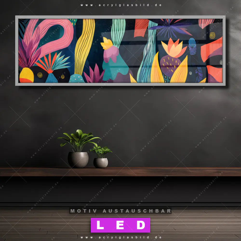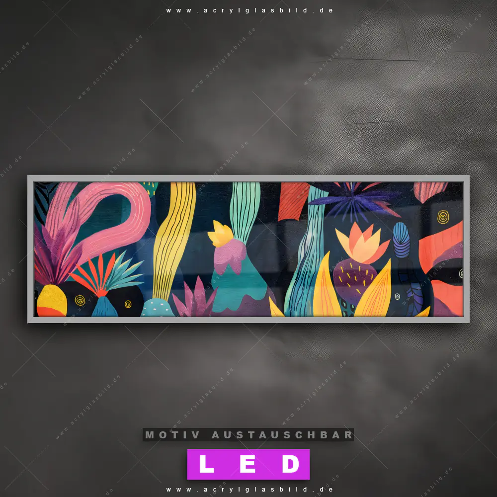 Wer will schon dunkle, triste Wände? Mit unserem LED Acrylglasbild Canvalight® DIA Farbenfrohe Pflanzen-Vielfalt und seiner fantastischen LED-Ausleuchtung werden deine Wände in Arzt - Praxis, Wohnzimmer - Schlafzimmer, Flur - Eingangsbereich zu echten Hinguckern. Wenn du auf der Suche nach einem beleuchteten Wandbild aus Acrylglas mit Natur, Pflanzen, Kakteen, Blätter, Flora bist, dann solltest du unser LED Leuchhtbild Lebendige Formen der Natur mit den beeindruckenden Motiv-Farben Schwarz, Gelb , Rot, Türkis, Rosa, Pink nicht verpassen. Gestaltet im angesagten Abstrakt, Floral, Modern Art Stil, passt das LED Bild mit DIA-Klapprahmen und wechselbarer Acrylglas-Scheibe perfekt zu jedem Einrichtungsstil – selbst in deinem kleinen Dschungel aus Kreativität und Chaos!