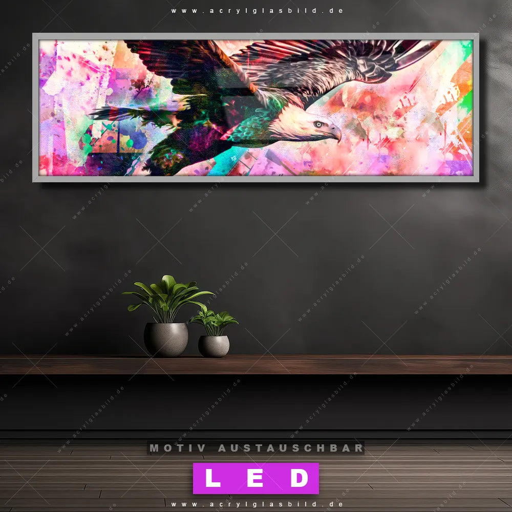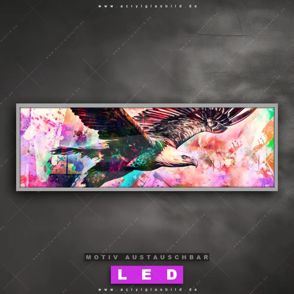 Deine Wände könnten dringend ein dimmbares LED Bild mit Fernbedienung und optionaler Farbtemperatursteuerung gebrauchen? Dann haben wir das perfekte Wandbild mit LED Beleuchtung für dich: unser mega-cooles Tierwelt Canvalight® DIA LED Acrylglasbild! Mit unserem angesagten Leuchtbild aus Acrylglas im Panorama-Format und der austauschbaren bedruckten Acrylglas-Scheibe Abstrakter Adler bringst du nicht nur Licht, sondern auch jede Menge Flair in deine Räume.