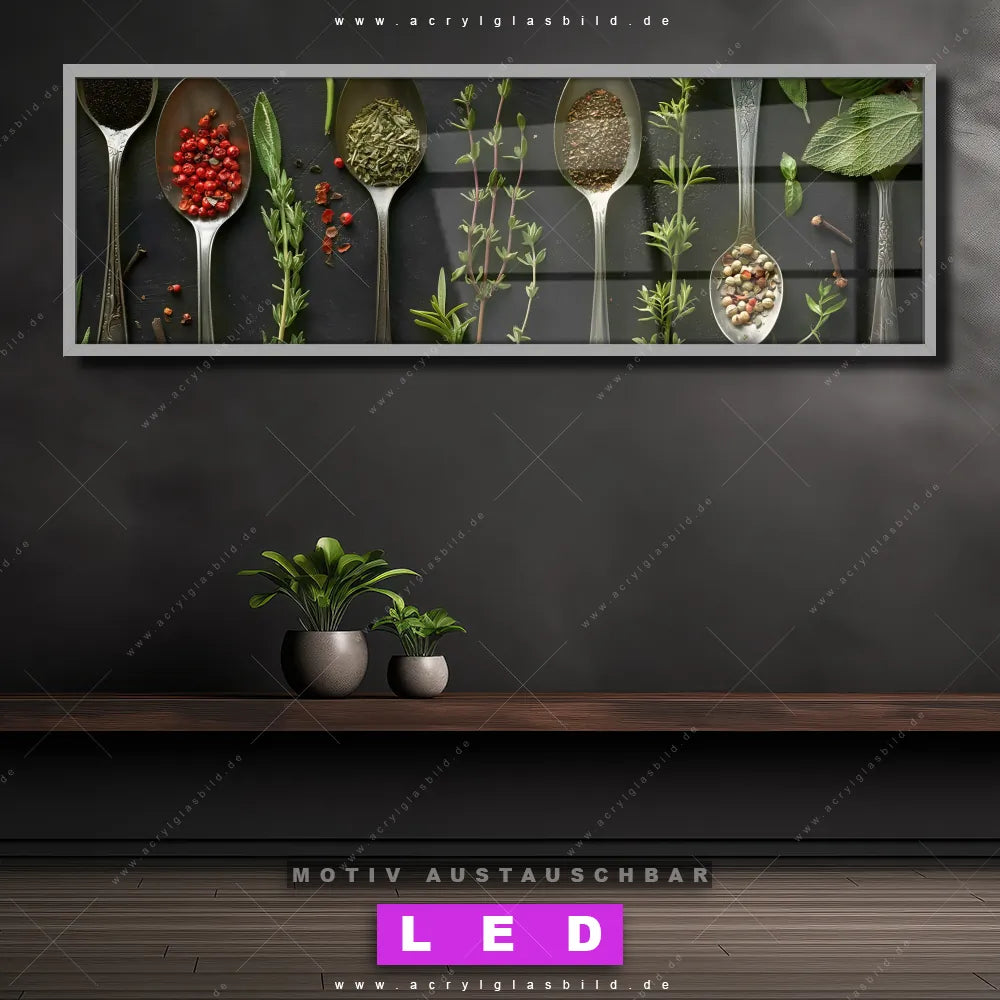 Wer will schon dunkle, triste Wände? Mit unserem LED Acrylglasbild Canvalight® DIA Löffel mit Gewürzen und seiner fantastischen LED-Ausleuchtung werden deine Wände in Bar - Gastronomie, Küche - Esszimmer zu echten Hinguckern. Wenn du auf der Suche nach einem beleuchteten Wandbild aus Acrylglas mit Löffel, Besteck, Kräuter, Gewürze, kochen, Zutaten, Lebensmittel, Geschmack, Aromen bist, dann solltest du unser LED Leuchhtbild Kulinarische Vielfalt auf Löffeln mit den beeindruckenden Motiv-Farben Silber, Schwarz, Grün nicht verpassen. Gestaltet im angesagten Natürlich - Realistisch Stil, passt das LED Bild mit DIA-Klapprahmen und wechselbarer Acrylglas-Scheibe perfekt zu jedem Einrichtungsstil – selbst in deinem kleinen Dschungel aus Kreativität und Chaos!
