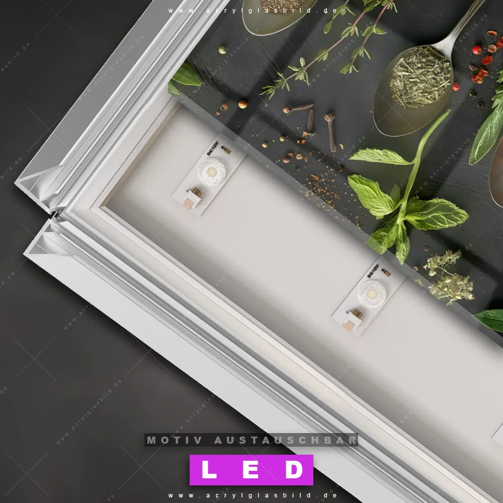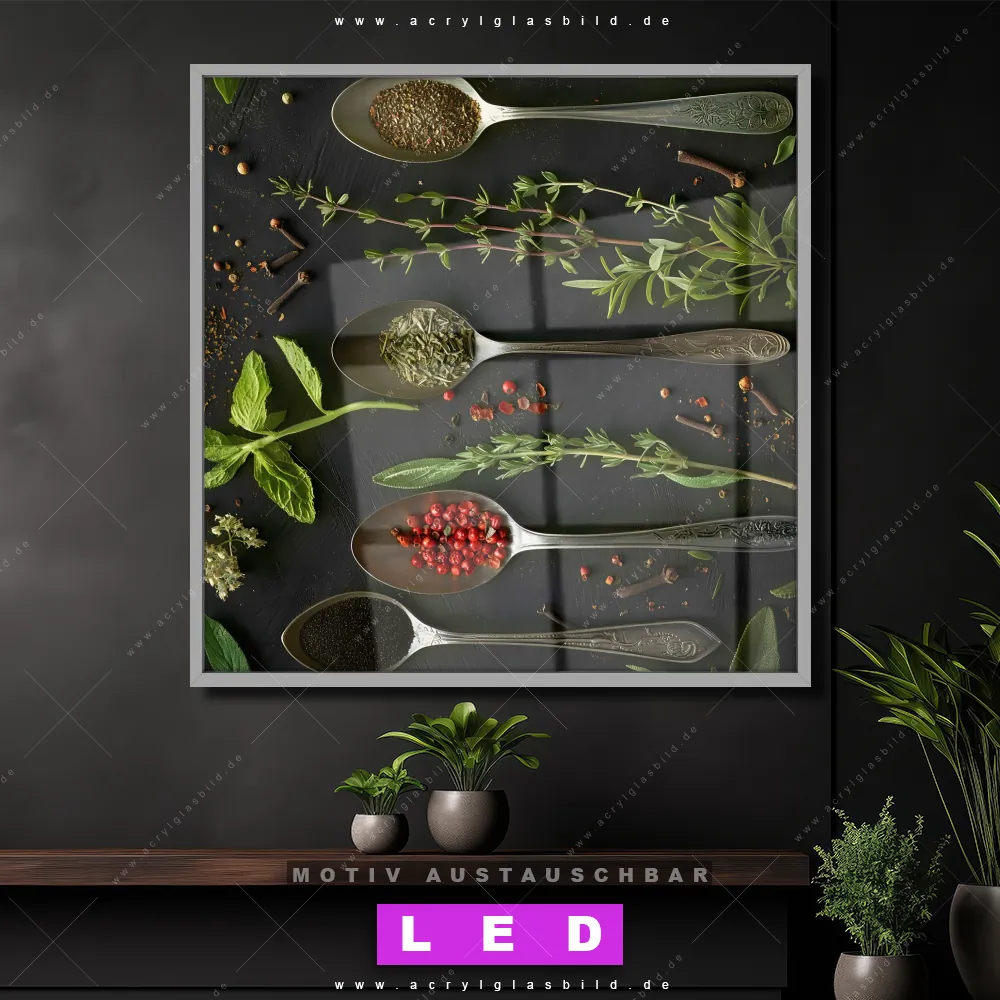Also, worauf wartest du noch? Gib mit einem beleuchteten Wandbild mit wechselbarer Acrylglas-Scheibe deinen Wänden das gewisse Etwas und bestelle jetzt das LED Acrylglasbild Canvalight® DIA Würzige Zutaten – dein Zuhause wird es dir danken und deine Freunde werden dank der wechselbaren Motive erblassen!